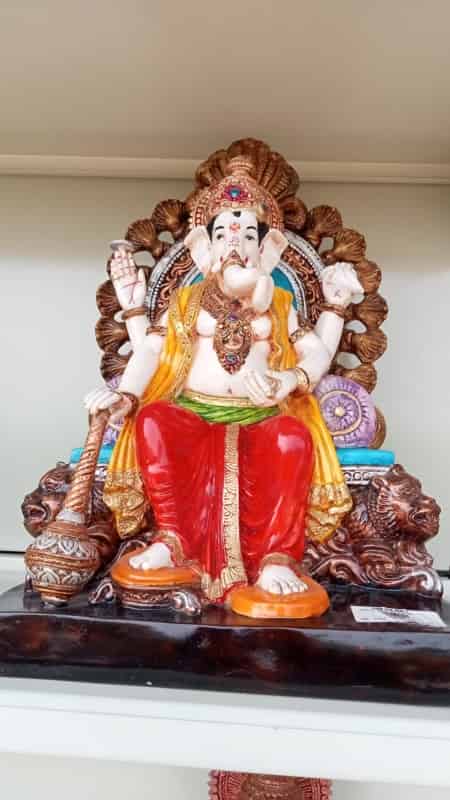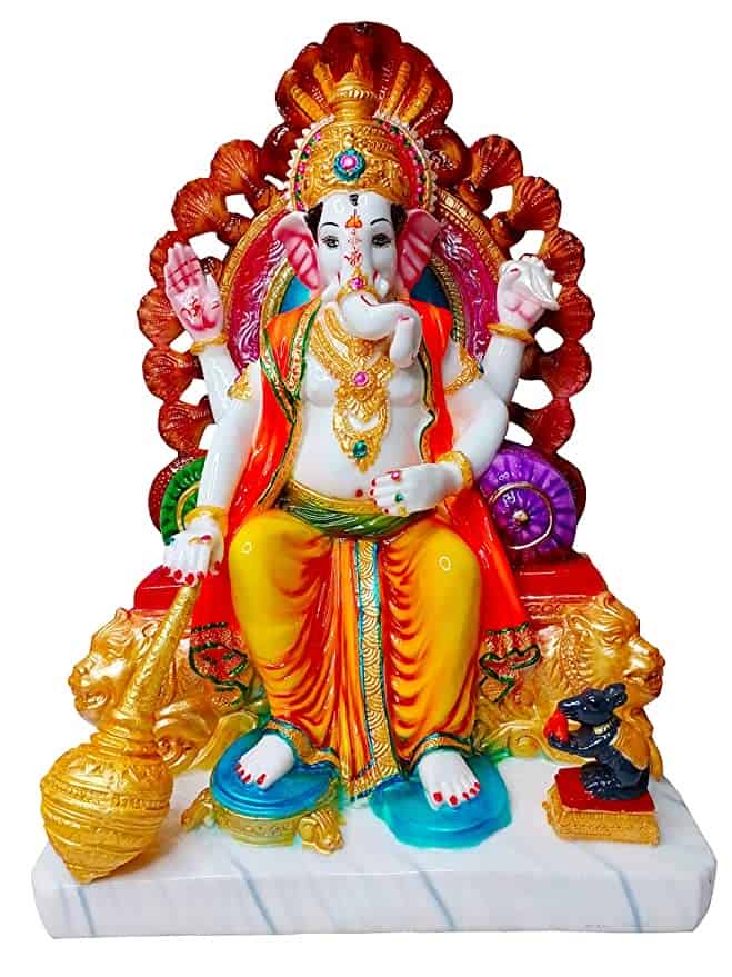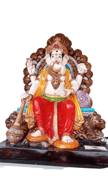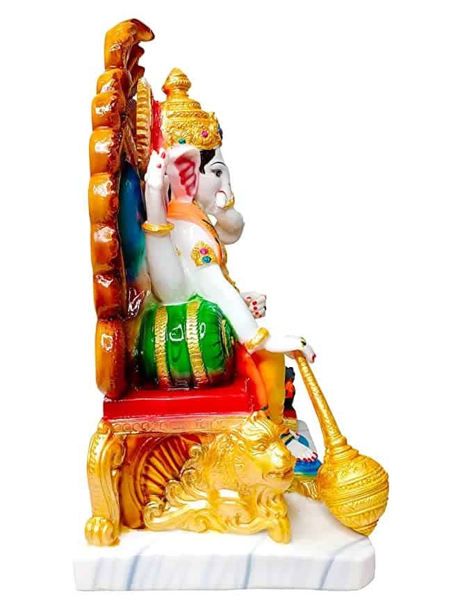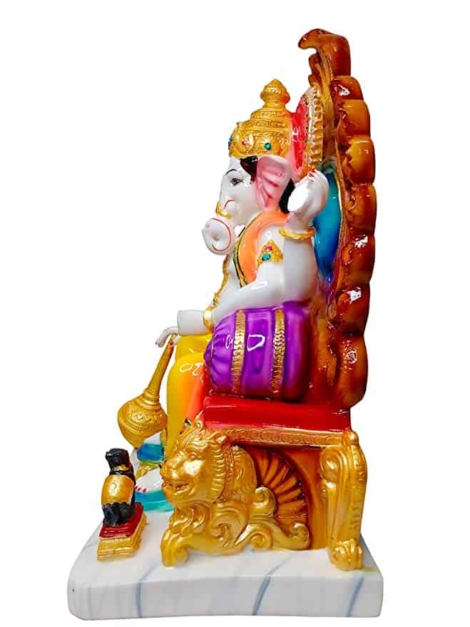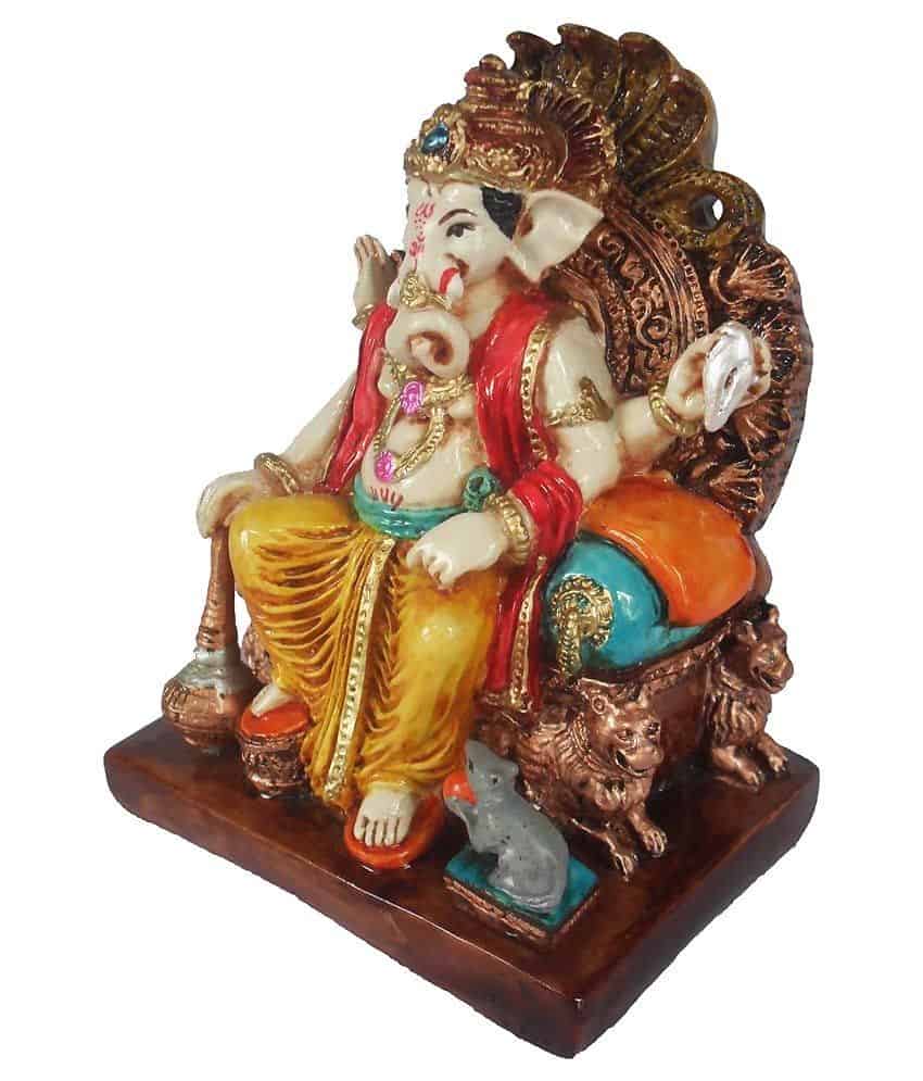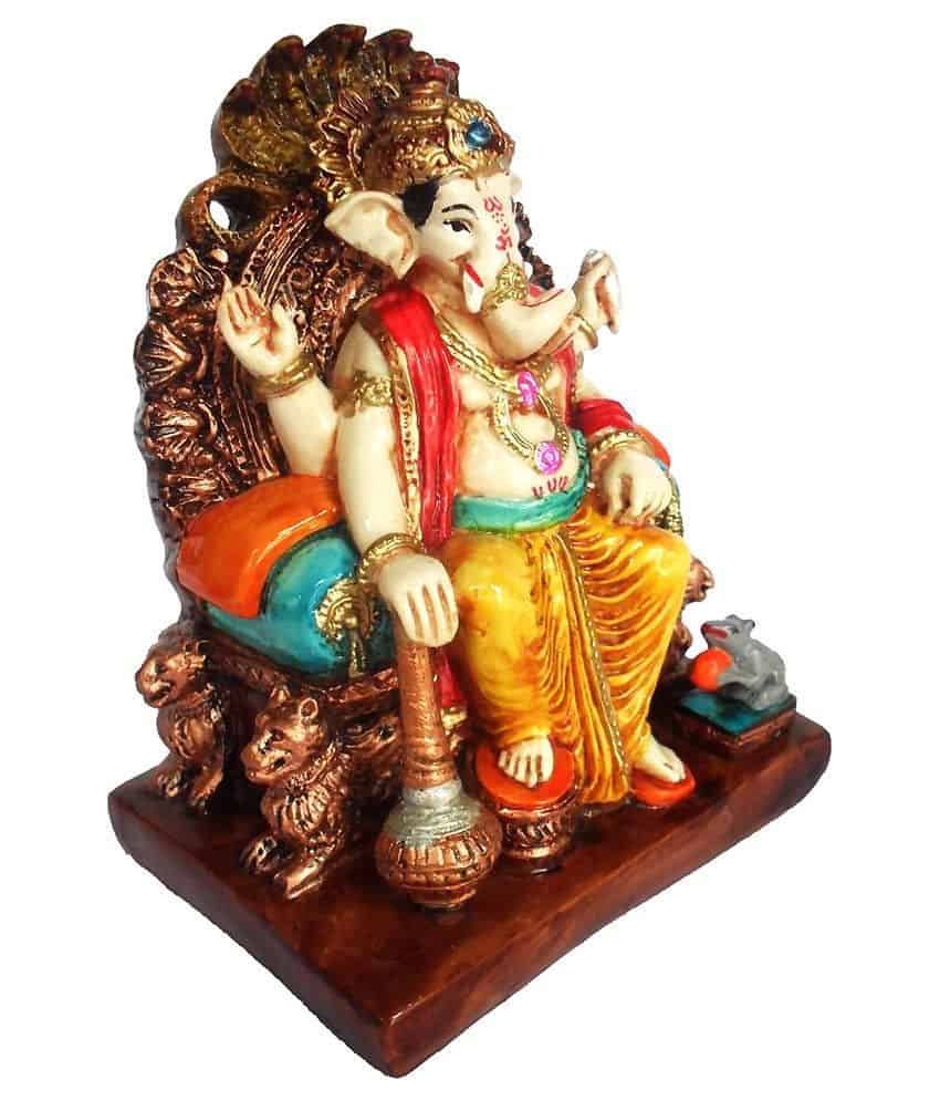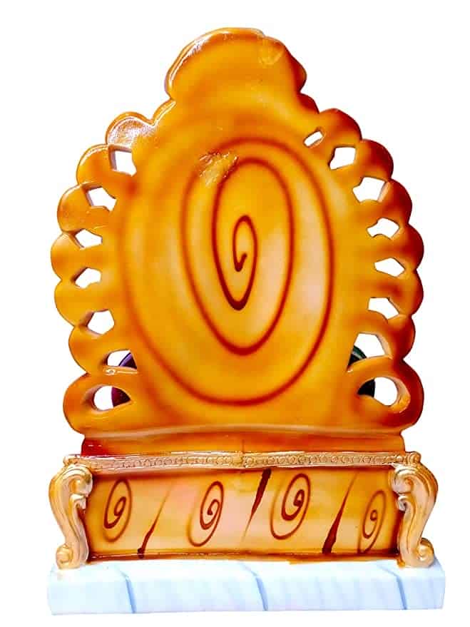 A beautifully carved sinhasan Ganesha of a calm & peaceful meditating sculpted in resin powder.place it in your living room and get praised for your exclusive choice. Lord ganesha is known as god of wisdom, success and prosperity and is widely revered as the remover of obstacles. As the god of beginnings, he is honored at the start of rituals and ceremonies.this well finished miniature Ganeshji is a great option for decoration on a festival, placing in worship area or gifting on various auspicious occasions. The idol is made with high quality multicolored poly resin. A great gift idea for house warming's and festivals.