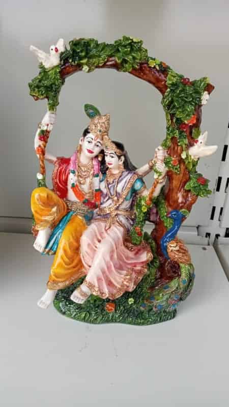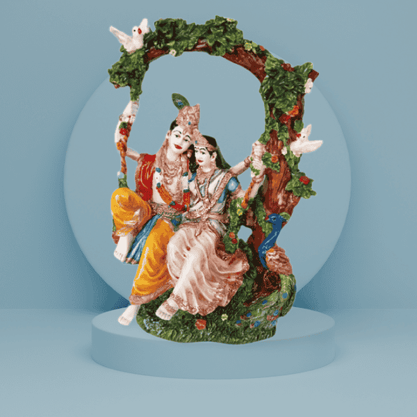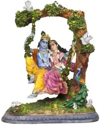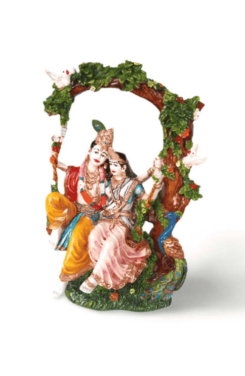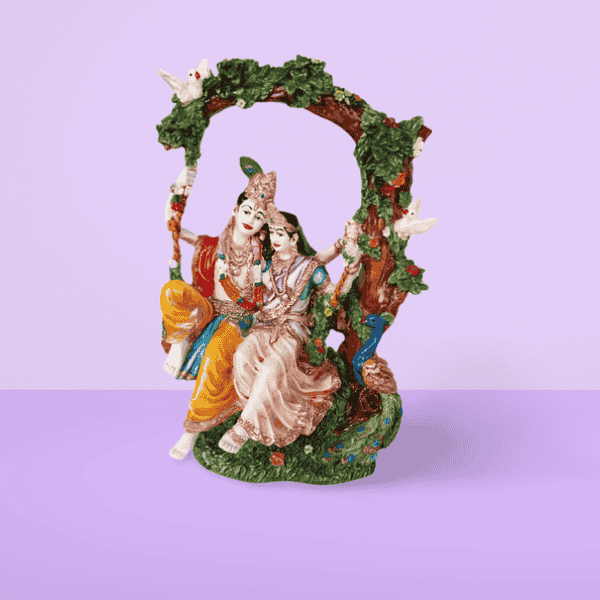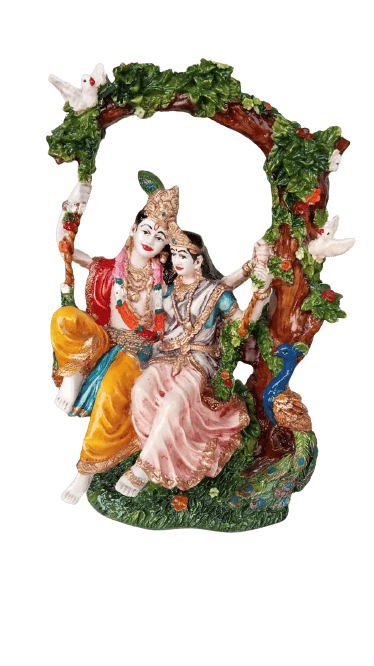 Radha and Krishna are swinging joyously from the verdant trees of Vrindavan, in order to find relief from the hot summer. Krishna is holding the flower ropes with both hands, while Radha clings to Krishna. Their beloved peacock and some white birds are watching the scene.This beautiful statue is made in high quality Polyster Resin, with meticulous hand painting to exhibit the fine details. The brilliant waterproof paint makes this statue ideal not only for decoration but also for altar worship as well.