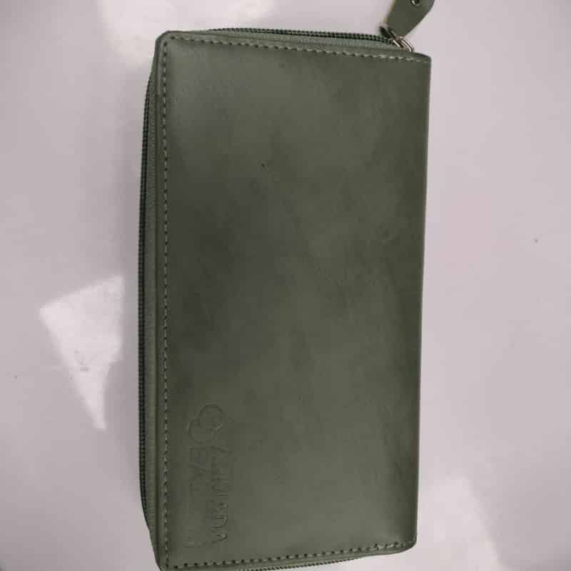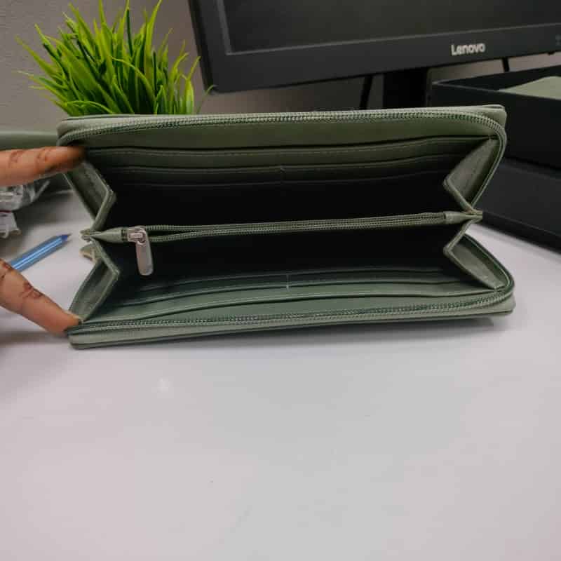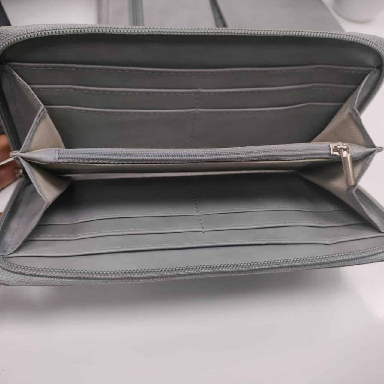 12 Credit Card Slots, 1 ID Window, 1 Zipper Pocket, 2 Full-length Bill Compartments, 2 Concealed Compartments, 1 Wrist Strap.