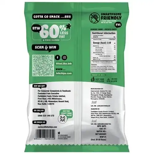 Enjoy the BRB Bhel Flavour Potato chip that is neither Baked nor fried but are Popped Chips. With a Light crunchy flavour these chips are Smartphone-Friendly for a smudge-free experience. It is a healthier snacking option because it contains 60% less fat compared to fried potato chips and contains roughly only 100 calories in every Solo Pack. Moreover, it's gluten-Free So, whenever you feel the urge to snack, shout out BRB!