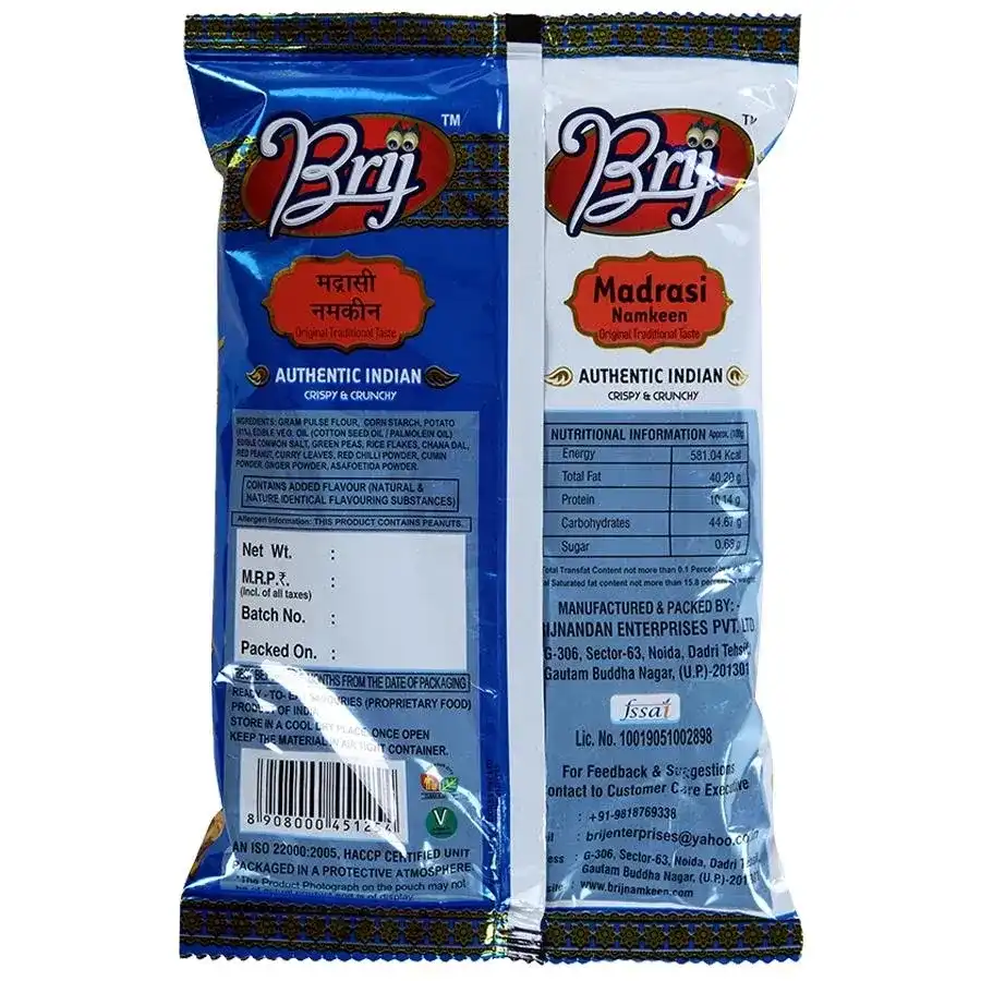 Brij's madrasi namkeen is a south Indian mixture. It is a very delicious and well-liked snack in south India. It prepared by using superiority of ingredients like gram pulse flour veg oil(cottonseed oil), common salt, puffed rice flakes, curry leaves, peanut, gram, corn starch and spices such as chilli powder, cumin, dried mango powder, hing.