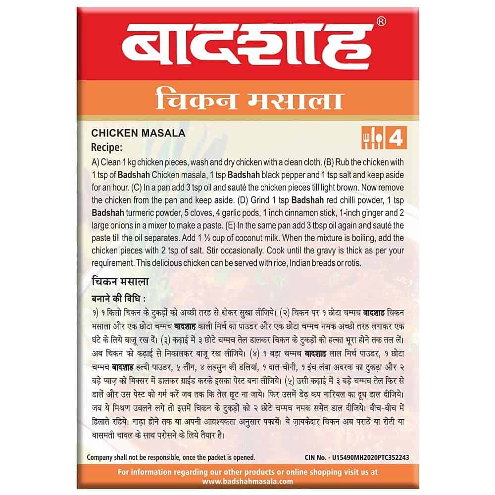 Badshah chicken masala is an essential masala for Indian preparation of chicken. This chicken masala is suitable for chicken tikka masala, butter chicken, tandoori masala and more.