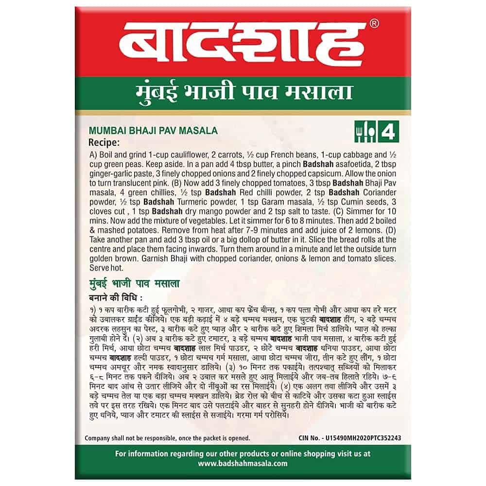 Badshah Mumbai Bhajipav Masala – The most renowned Indian street food pav bhaji is made up of a delicious medley of spices, mashed veggies, topped with a butter, coriander leaves and lemon juice.