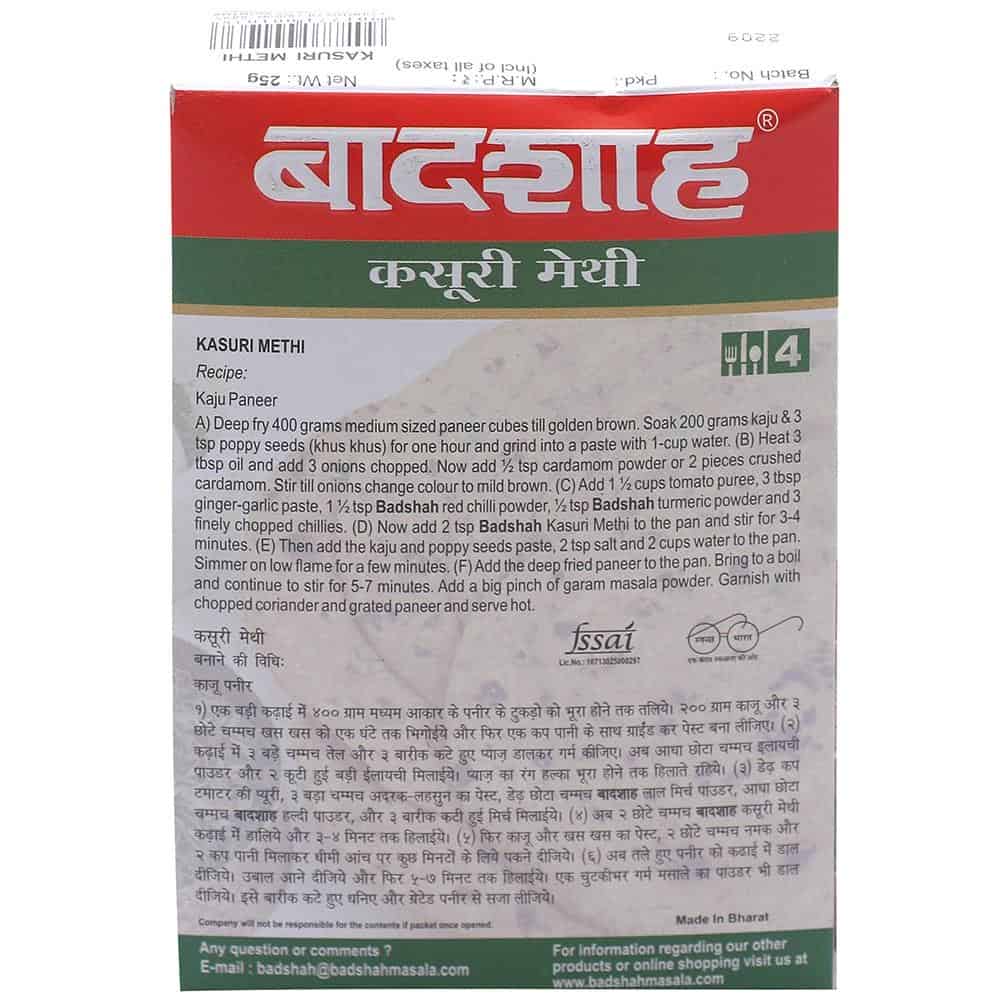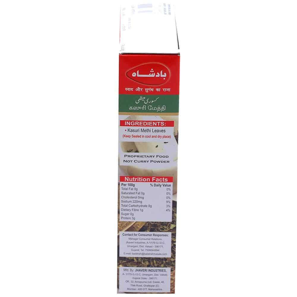 Kasuri Methi or Dried Fenugreek Leaves is a popular Indian condiment and herb. It renders your dish with a strong, bitter yet aromatic taste. Not to mention, it makes the dishes look appealing. Use Badshah Kasuri Methi to garnish vegetable delicacies or to make flavourful rotis and parathas.