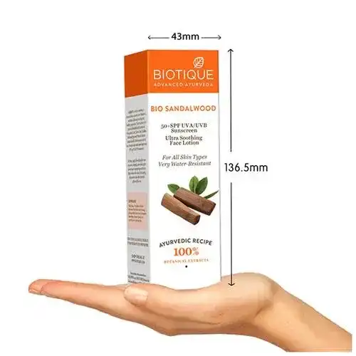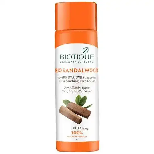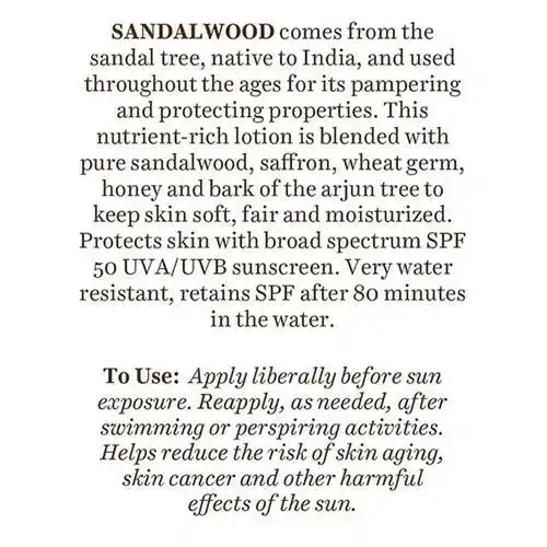 This nutrient-rich lotion is blended with pure sandalwood, saffron, wheat germ, honey and bark of the arjun tree to keep skin soft, fair and moisturized. Protects skin with broad spectrum SPF 50 UVA/UVB sunscreen. Very water resistant, retains SPF after 80 minutes in the water.