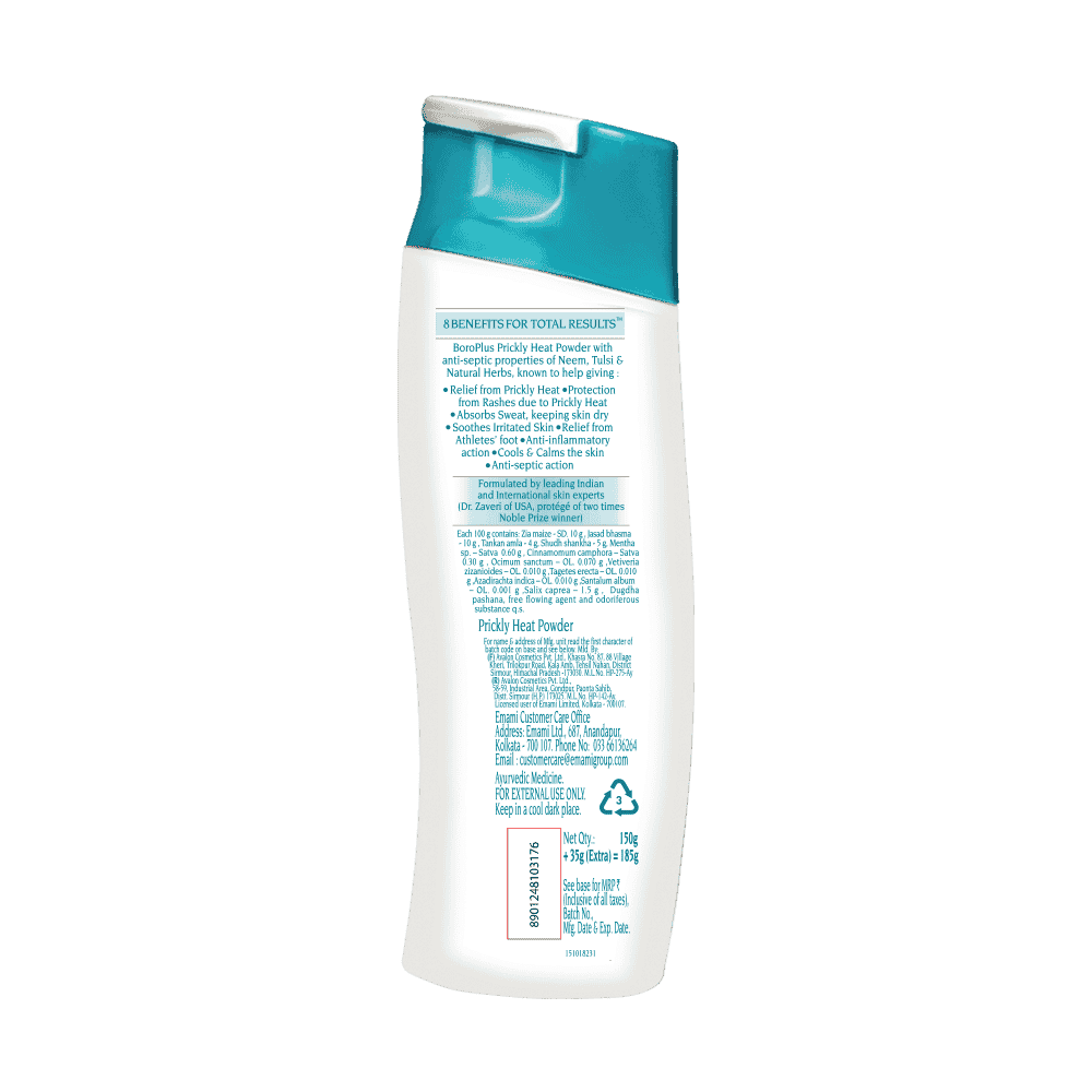 Summer means prickly heat, excessive sweating, rashes and skin irritation. BoroPlus Prickly Heat Powder contains natural ingredients, providing quick & long-lasting relief from prickly heat and has a cooling sensation. It also helps prevents skin problems like heat rashes, burning and itches that are most notable during summer. It is excellent in absorbing sweat and prevents body odour to keep you fresh, all day long. With herbal formulation comprising of Neem and Tulsi, it is mild, gentle and skin-friendly.