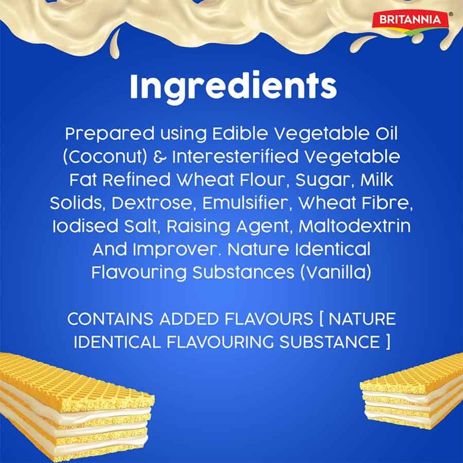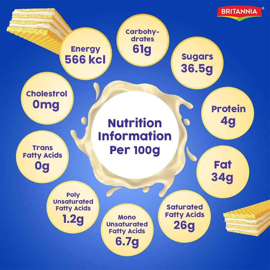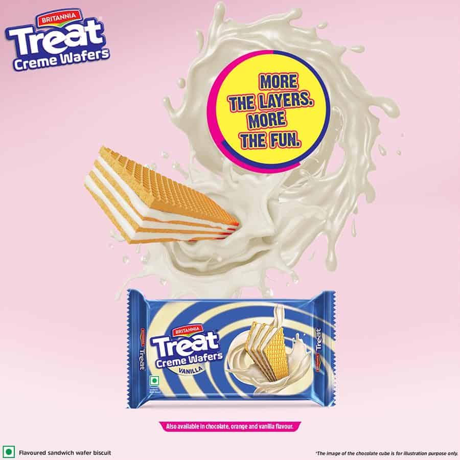 Britannia Treat Wafers Vanilla is a discovering journey of taste filled between the layers of crispy wafers. The vanilla flavour gives your taste buds a delectable taste while the crunchiness of wafers adds newness to it. Believing in delivering fresh and healthy products, Britannia India manufactures some of India's favourite brands like 50-50, Tiger, NutriChoice, Bourbon, Good Day, Milk Bikis and Little Hearts.
