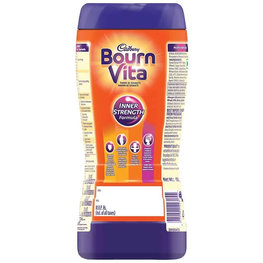 Cadbury Bournvita is a nutrition brand with a 70 year legacy in India. Cadbury Bournvita is a health food drink with inner strength formula which has nutrients that support - Immune system(8 immunity nutrients), Strong bones (Vitamin D, Phosphorous), Strong muscles (Protein, Vitamin D) and Active Brain(Iron, Iodine, Vitamin B2, Vitamin B12).