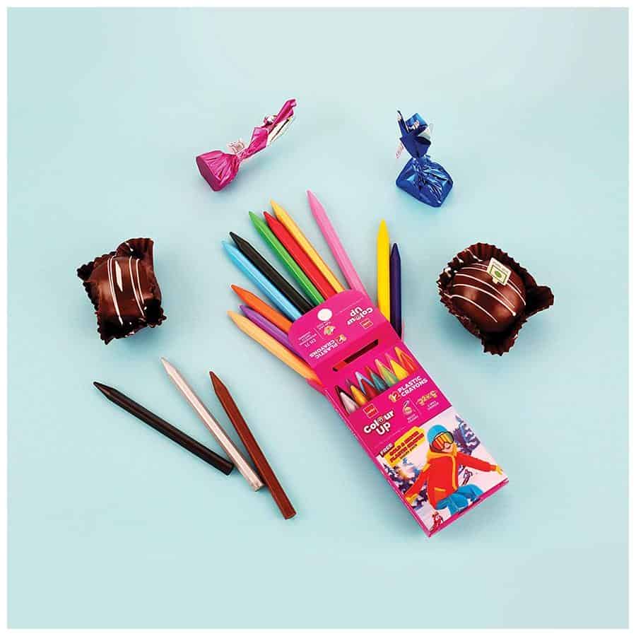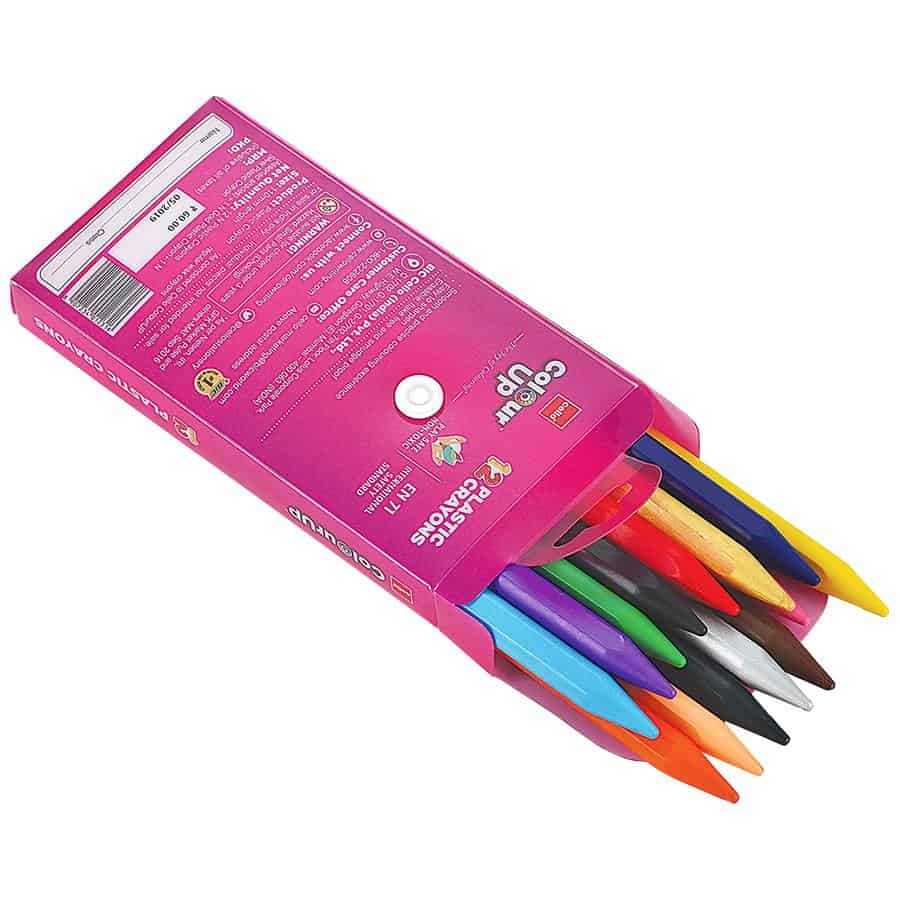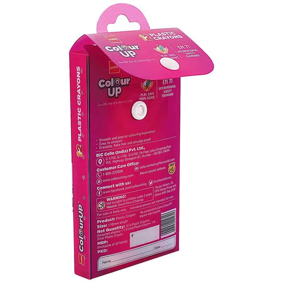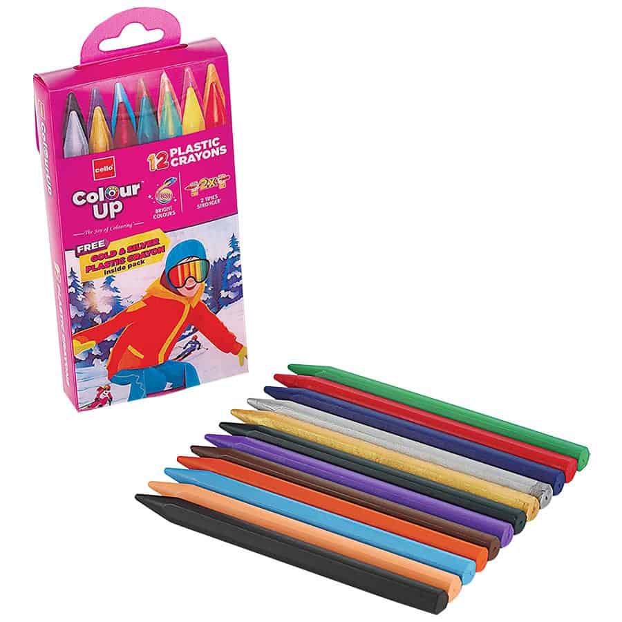 Cello Includes 12 different bright colours, plus free golden and silver colour plastic crayons for extra creativity. Non-toxic play safe materials used, compliant with European toy standards (EN-71 certified. 2 times stronger body, to prevent breaking of crayons while using. Attractive adventure-themed pack, ideal for gifting to all kids. Special Tic-Tac button pocket pouch, easy to carry and fun to use.