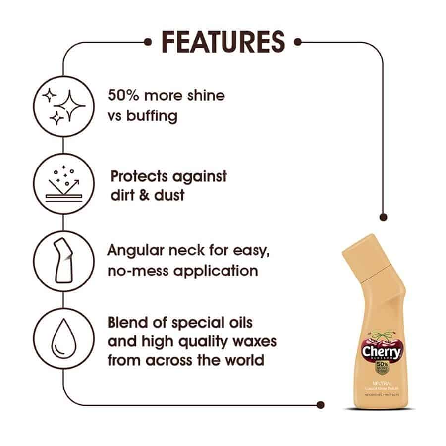 Cherry Blossom Liquid Shoe Polish is a product, which is designed to polish and restore the colour of your shoes and boots. Also, whatever the weather would be, this shoe polish helps to keep your best look and you will be ready to impress the crowd. It is a traditional shoe polish for leather footwear that works to give an unmistakable shine and restore the colour of your favourite leather footwear. It also nourishes and protects your shoes, also, preventing them from cracking. This liquid shoe polish has a blend of special oils and waxes from across the world, which gives 50% more shine to your shoes and also, works to give your shoes the decent possible protection against water and stains.
