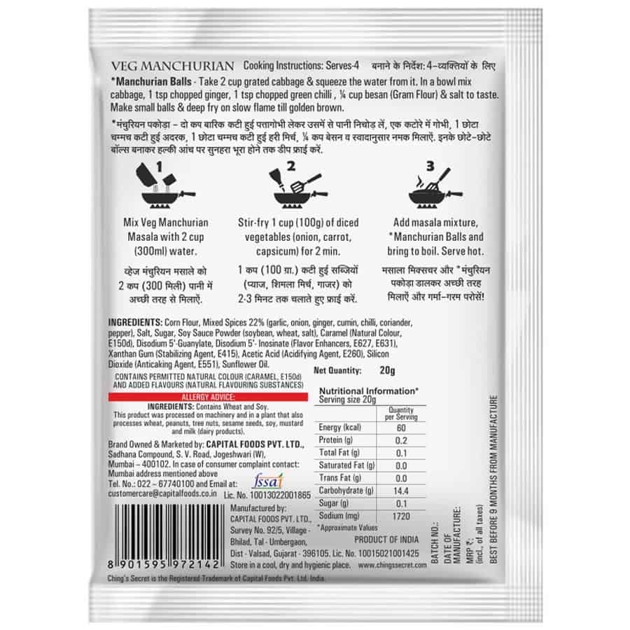 Easy-to-cook Masala Now make India’s favourite Desi Chinese dishes for your family at home! Cook up a different Desi Chinese dish every day with our Chinese Masala pouch. Now make Restaurant Style Manchurian with ease at home, because ' Ching's Secret Manchurian Masala hai nah'. It is so perfectly blended that you don’t even need to add any salt, spice or sauces additionally. Cook up your favourite Veg/ Gobi Manchurian with total ease in a few simple steps. Ab jab bhi kare dil, Ching’s Desi Chinese nahin mushkil!
