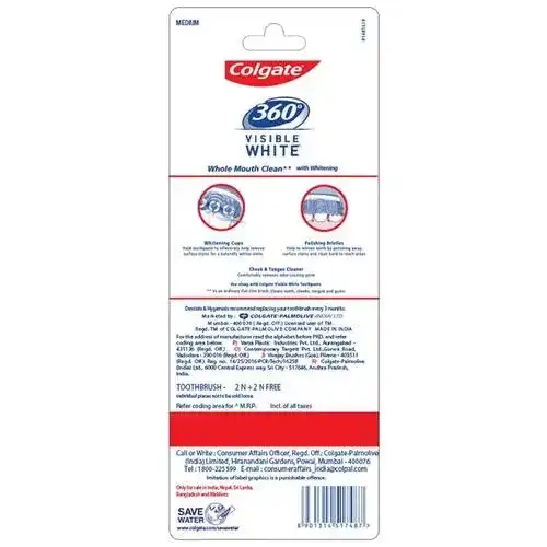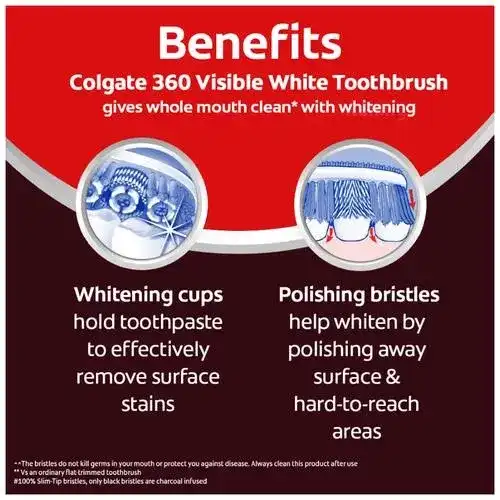 Bring home the Colgate 360° Visible White Toothbrush - An expertly designed toothbrush for a whole mouth clean with whitening. The toothbrush head features unique whitening cups that hold toothpaste to help remove surface stains effectively. In addition, the soft polishing bristles further remove surface stains for a brighter smile. It also comes with a cheek and tongue cleaner, which comfortably removes odour causing germs, giving you a complete clean mouthfeel.