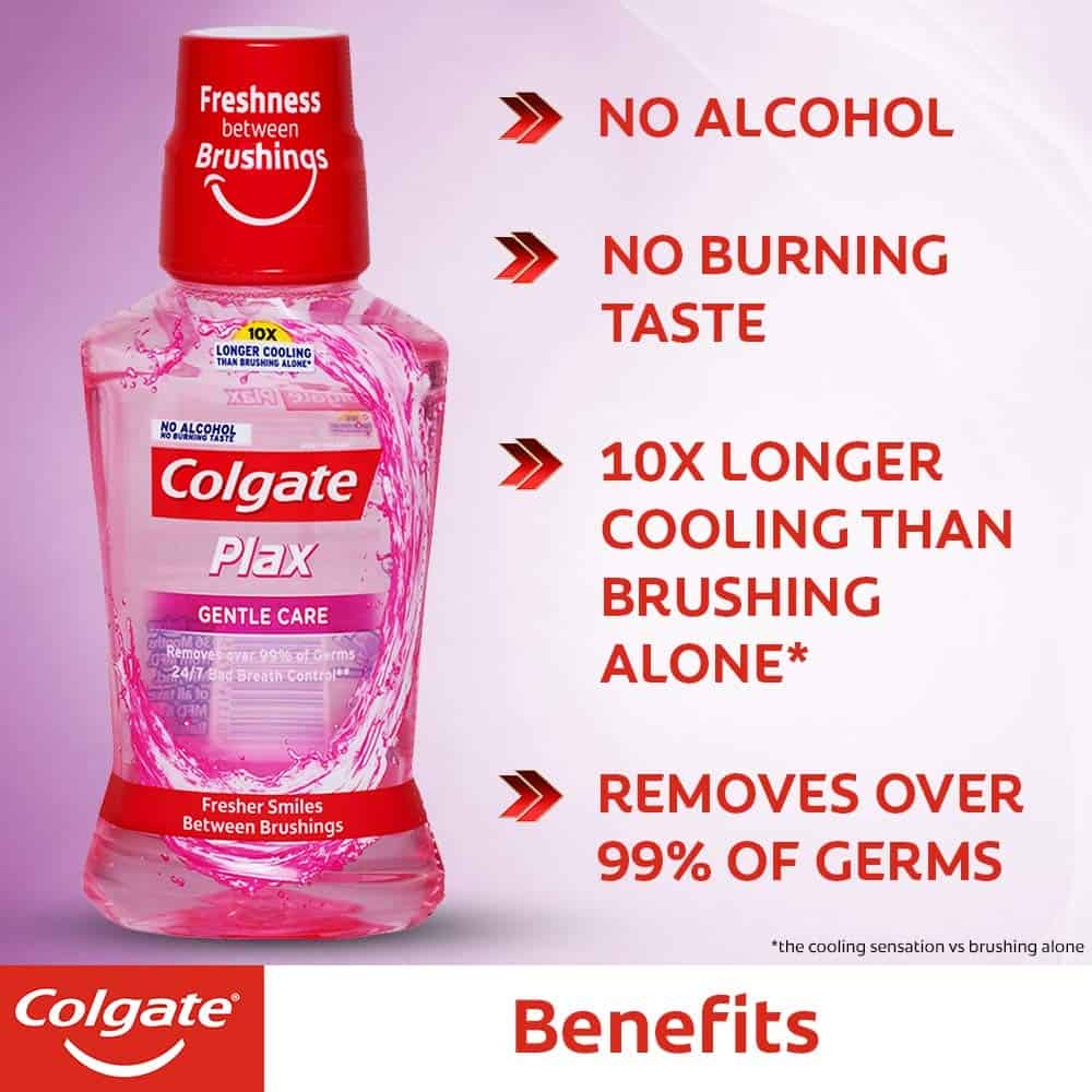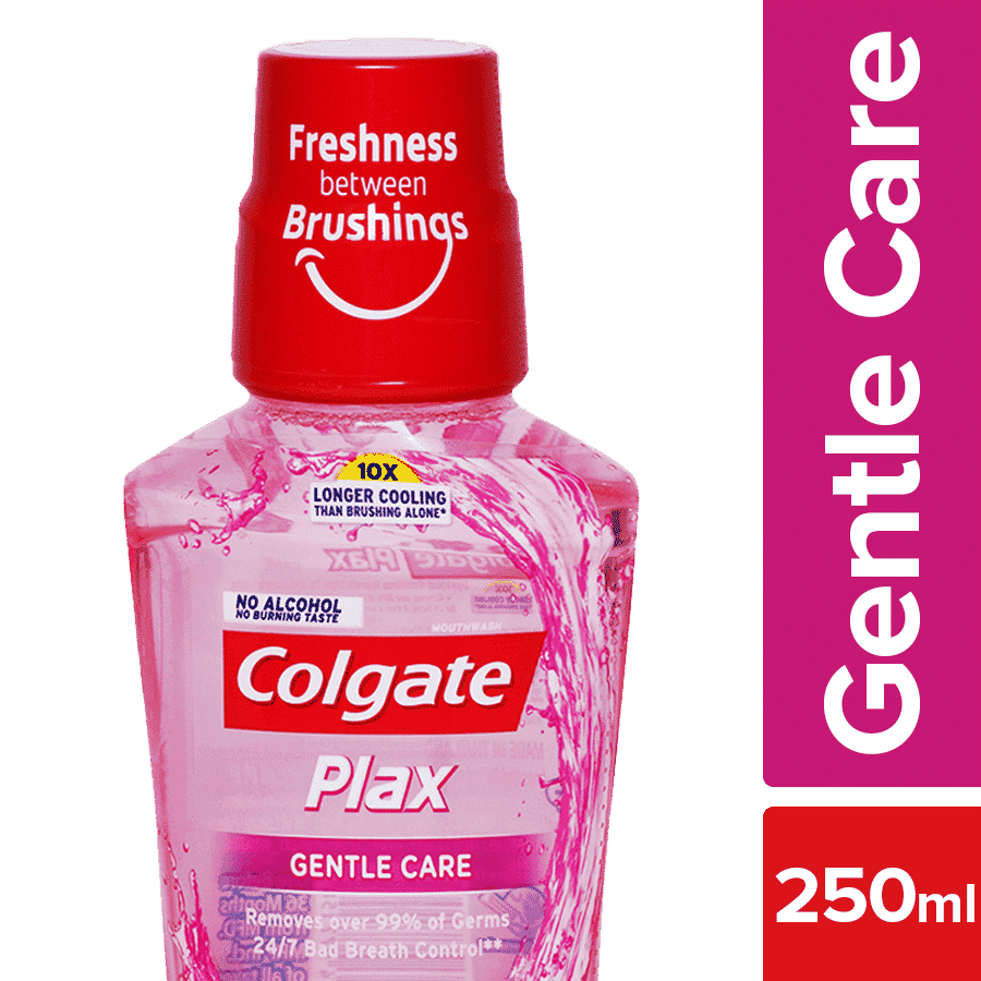Colgate Plax Gentle Care mouthwash removes over 99% of germs that cause bad breath and cavities, giving you a fresher and cleaner mouth than brushing alone. It has a unique formula that provides gentle care for sensitive teeth and gums.