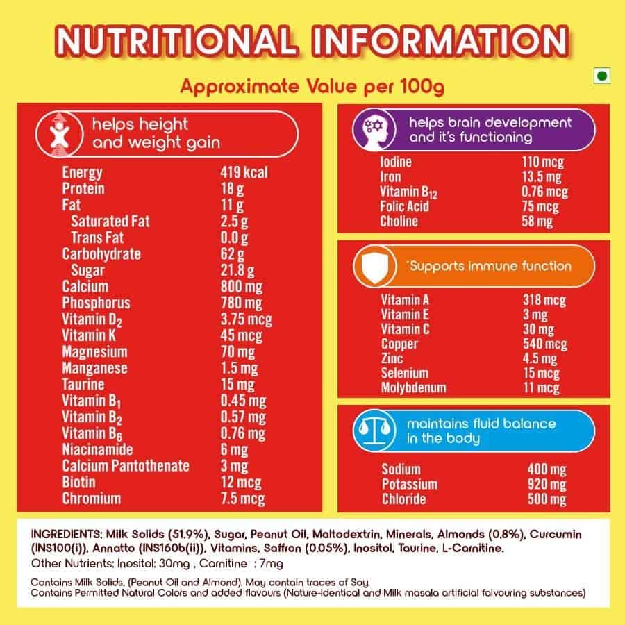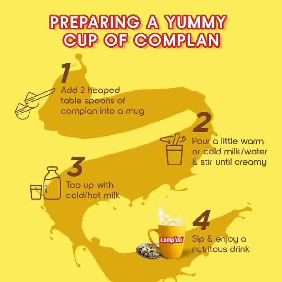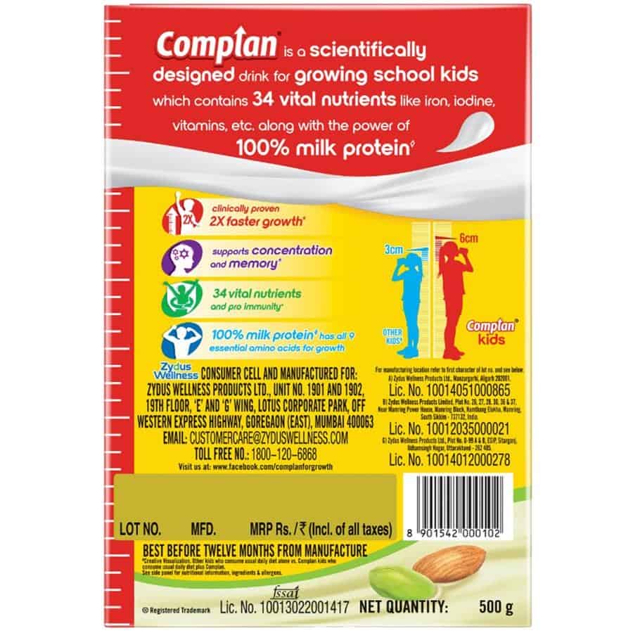 Complan is a scientifically designed nutrition and health drink with a clinically proven formula to give children 2X faster growth and Support their memory & concentration. It is one of the best health drinks for child growth as it contains 34 vital nutrients including the power of 100% milk protein. Complan can make delicious nutrition shake for kids as it is rich in nutrients. It has Iron, Iodine, Vit B12 which supports Brain development & functioning as well as Vit A, E & C which supports immunity. Give Complan to your children two times a day as a part of their daily balanced diet & help them grow 2X faster and support their memory & concentration. Refer pack for more details. Available in 4 delicious flavors - Royal Chocolate, Creamy Classic, Kesar Badam & Pista Badam.