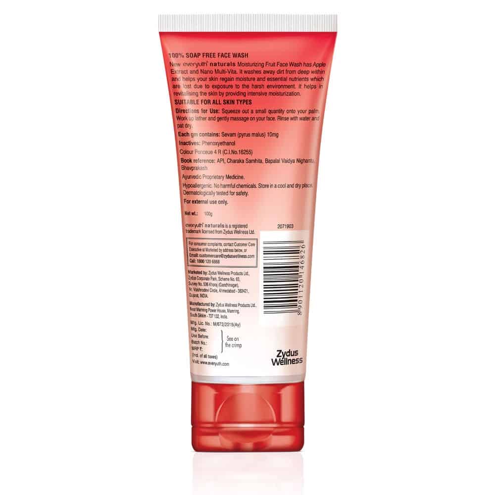 Zydus Wellness Ltd. Offers a range of skin care products under the brand nme of Everyuth nturals. While having the advantage of being a skincare brand from a healthcare company Everyuth nturals has always come up with products that address the different needs and skin types of young women. The products harness the goodness of ntural ingredients that are known for their efficacy and skin nurturing properties. As a result, the brand promises nture's safety and tender care along with the benefits of proven scientific research. Everyuth enjoys market leadership in skincare segments like face masks and scrubs and has a strong position in the face wash segment as well. New Everyuth Naturals Moisturizing Fruit Face Wash has Apple Extract and Nano Multi-Vita. It washes away dirt from deep within and helps your skin regain moisture and essential nutrients which are lost due to exposure to the harsh environment. It helps in revitalising the skin by providing intensive moisturization.