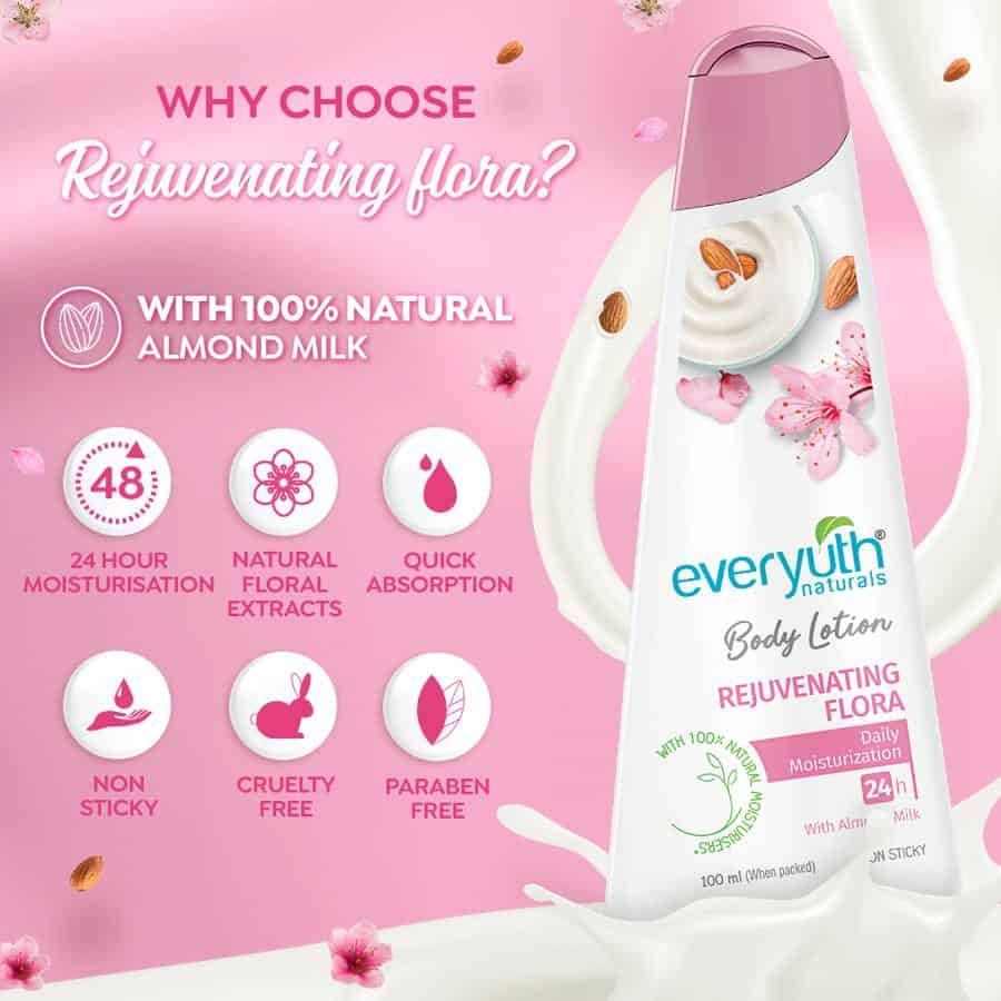The Everyuth Naturals Rejuvenating Flora Body Lotion is an amazing blend of delicate floral goodness with 100% natural Almond Milk. This moisturizer pampers your skin with natural ingredients. Gentle, sensitive care to rejuvenate your skin.
