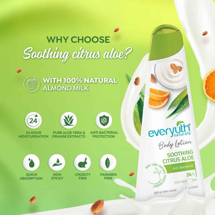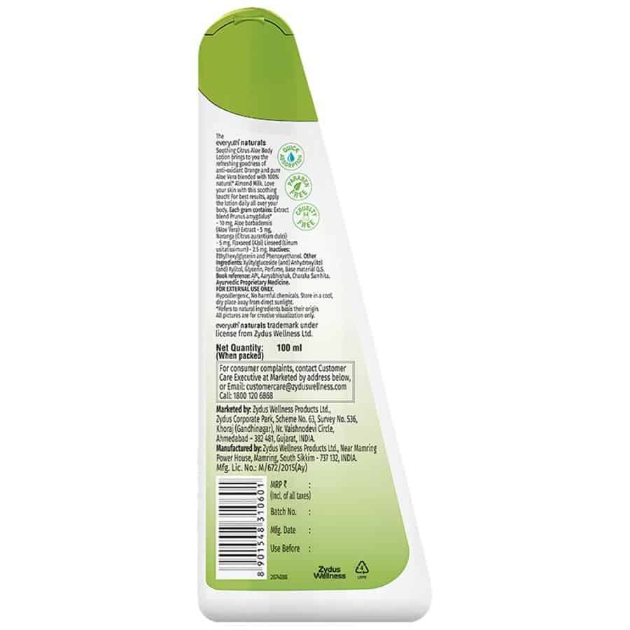 The Everyuth Naturals Soothing Citrus Aloe Body Lotion brings to you the refreshing goodness of anti-oxidant Orange and pure Aloe Vera blended with 100% natural Almond Milk. Using this lotion will keep your skin moisturized and hydrated for a long time. Love your skin with this soothing touch!