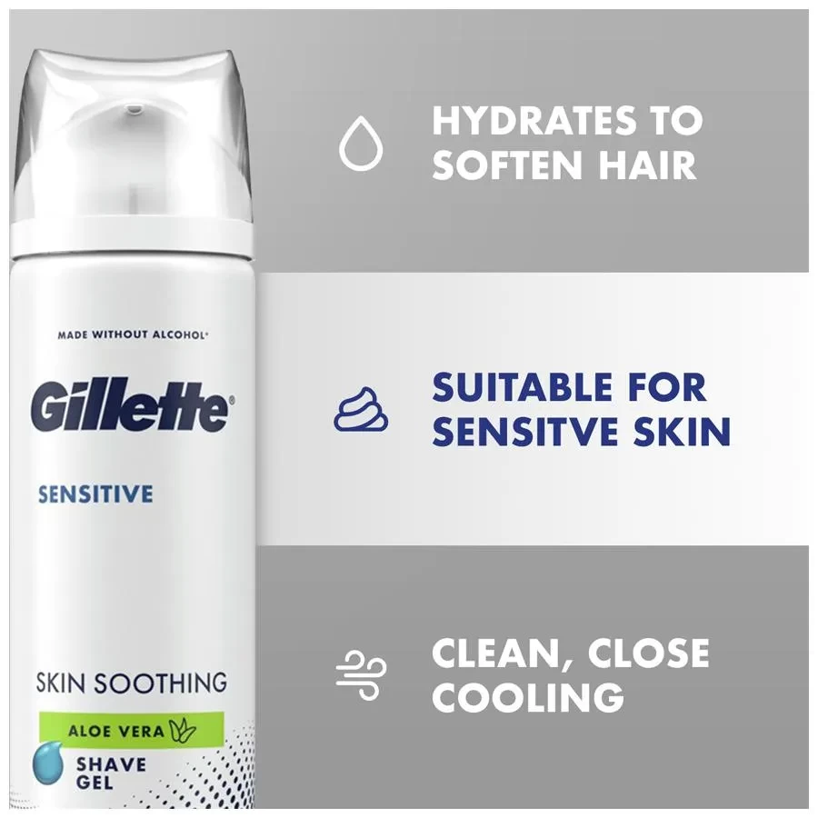 With 3x action formula, Gillette Sensitive Skin Soothing shaving gel hydrates, protect and soothes your skin. Formulated with Aloe, Series Sensitive shaving gel helps protect your sensitive skin against the 5 signs of shaving irritation: nicks and cuts, tightness, redness, burning and stinging. For an incredibly comfortable shave use Gillette Sensitive Skin Soothing shave gel with Gillette Mach3 razor.