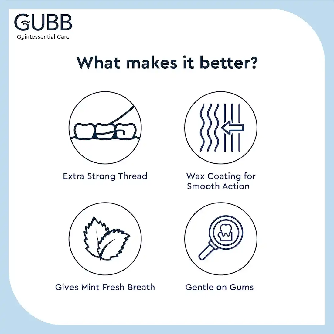 Our overall health is not complete without proper oral hygiene. Brushing alone only removes the plaque from the surface of the teeth and not between them. This is why GUBB USA Mint Waxed Dental Floss is an essential part of your oral hygiene routine. This floss is a must for those hard to reach areas between the teeth. Flossing not only makes your smile look attractive but it also helps to protect your teeth from plaque which may otherwise cause cavities in future. This mint flavoured floss helps give you a bright and healthy smile.