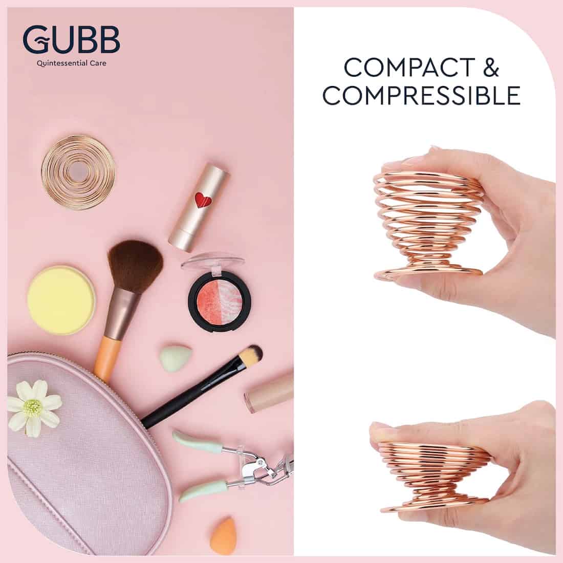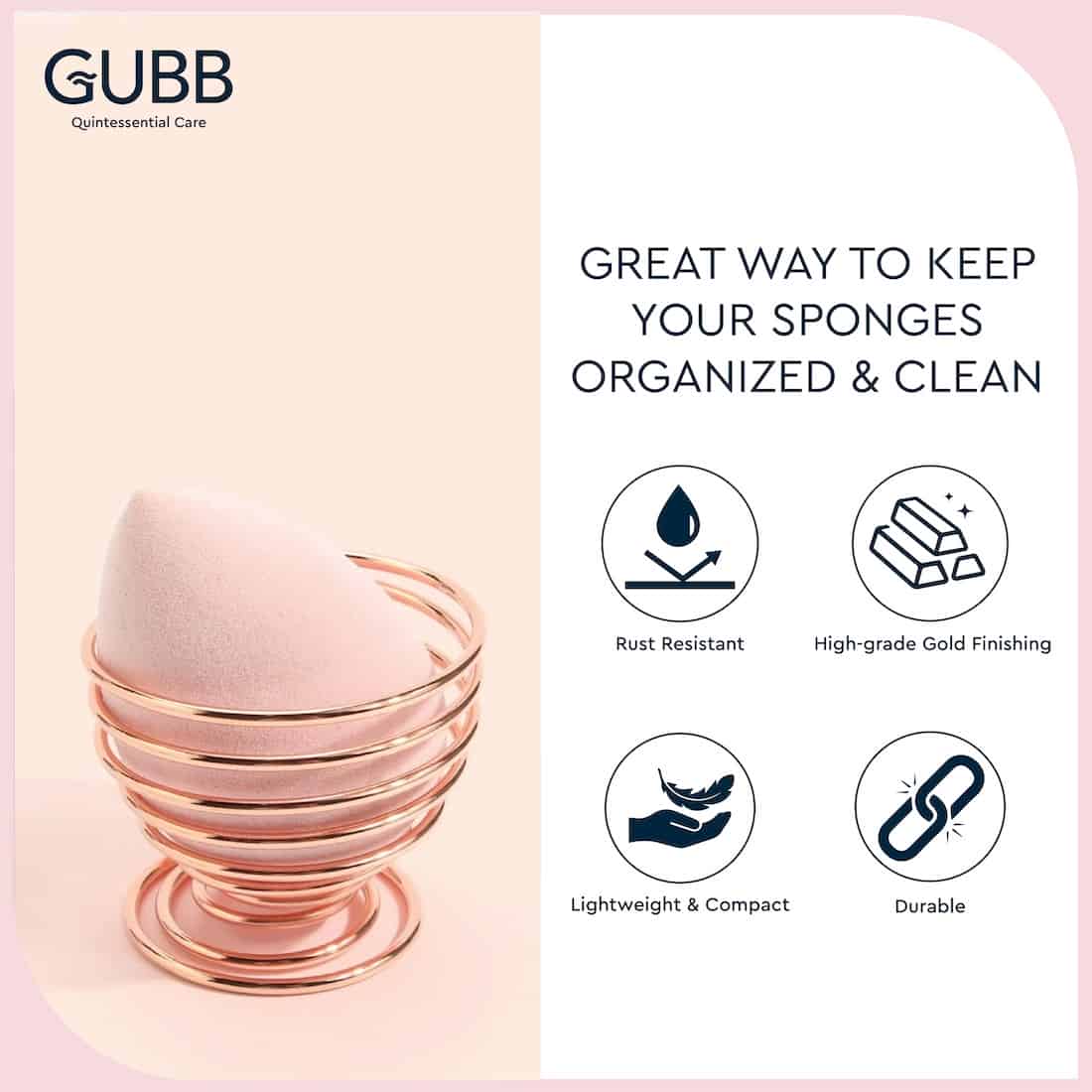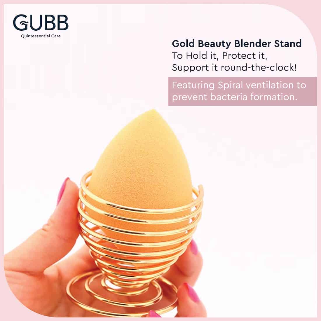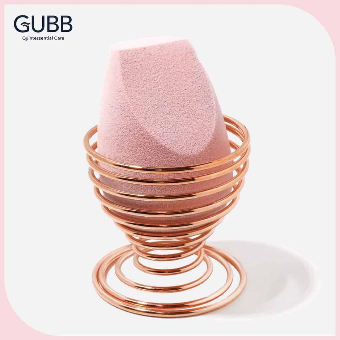GUBB Makeup Blender Stand in the gorgeous gold finish holds all of your favourite makeup sponges hygienically. Built to store, organize, protect and preserve your beauty blenders for long-term use. It provides spiral ventilation for hygienic drying after every rinse off. It has a sleek, lightweight & compressible design to make it an ideal companion for travelling.