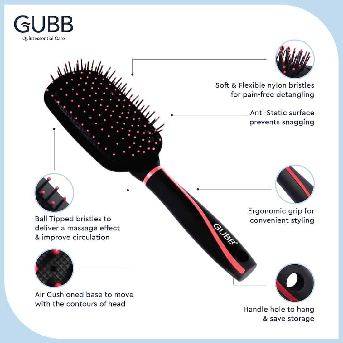 Cushioned-Base Comfort – GUBB Paddle brush features cushioned base which helps it to bend and move to the contours of head without much effort and thus it becomes easier to detangle and straightened the jumbled-up hair strands like a professional hair stylist.