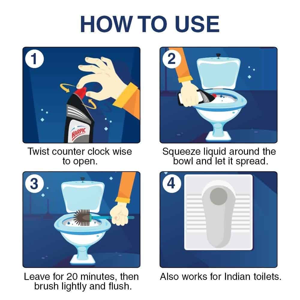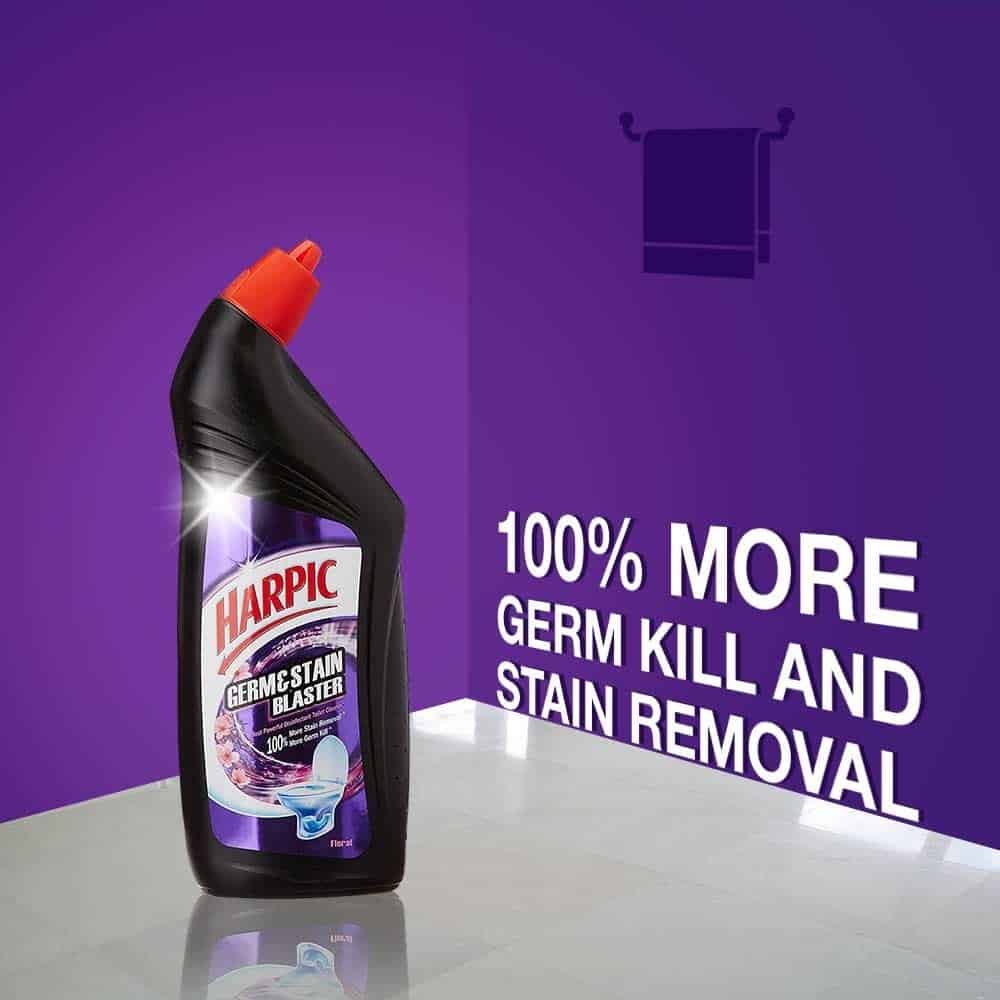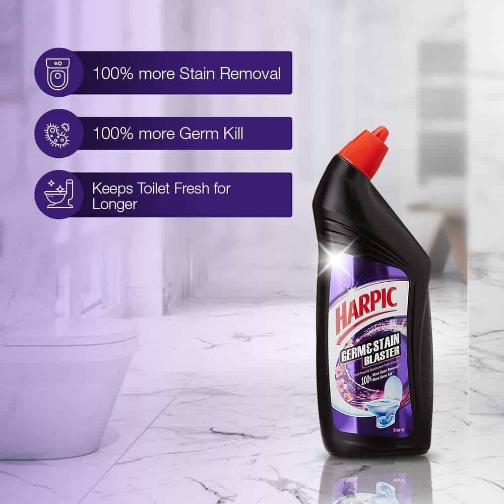 Harpic Germ and Stain Blaster is a powerful toilet cleaner, the strongest of the Harpic lot that gives you unbeatable cleaning both above and below the waterline and citrus freshness for the toilet. Its thick liquid formula with powerful cleaning agents clings to the toilet surface and removes the toughest stains and kills the sturdiest germs, providing your toilet 100 % more stain-removal and 100 % better germ protection. It also gives your toilet a pleasant fresh fragrance and helps avoid odour for long.