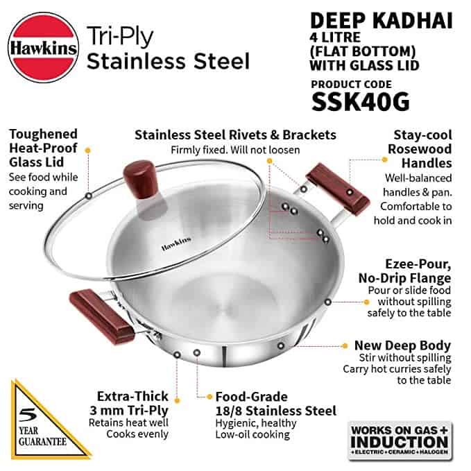 Hawkins 4 Litre Deep Kadhai, Triply Stainless Steel Kadai with Glass Lid, Silver (SSK40G)