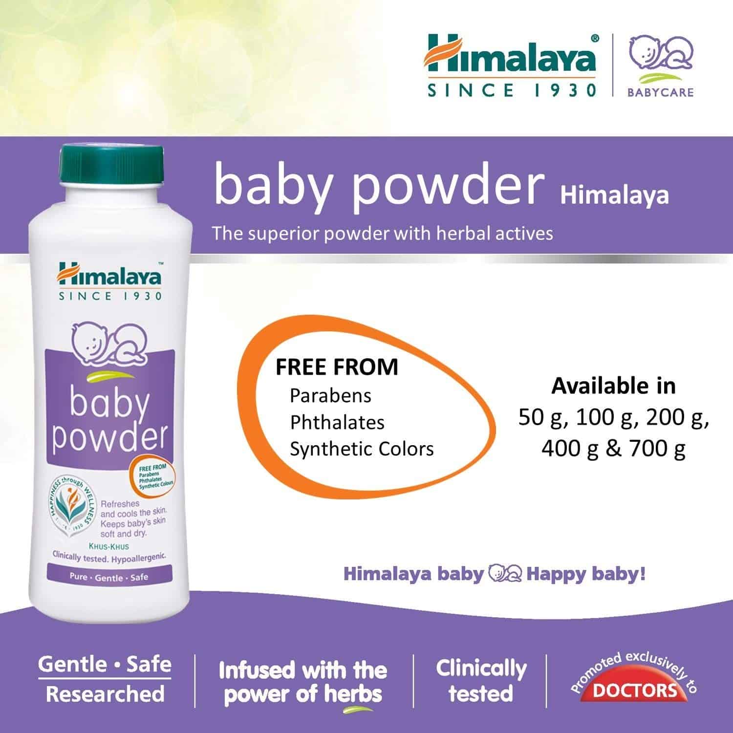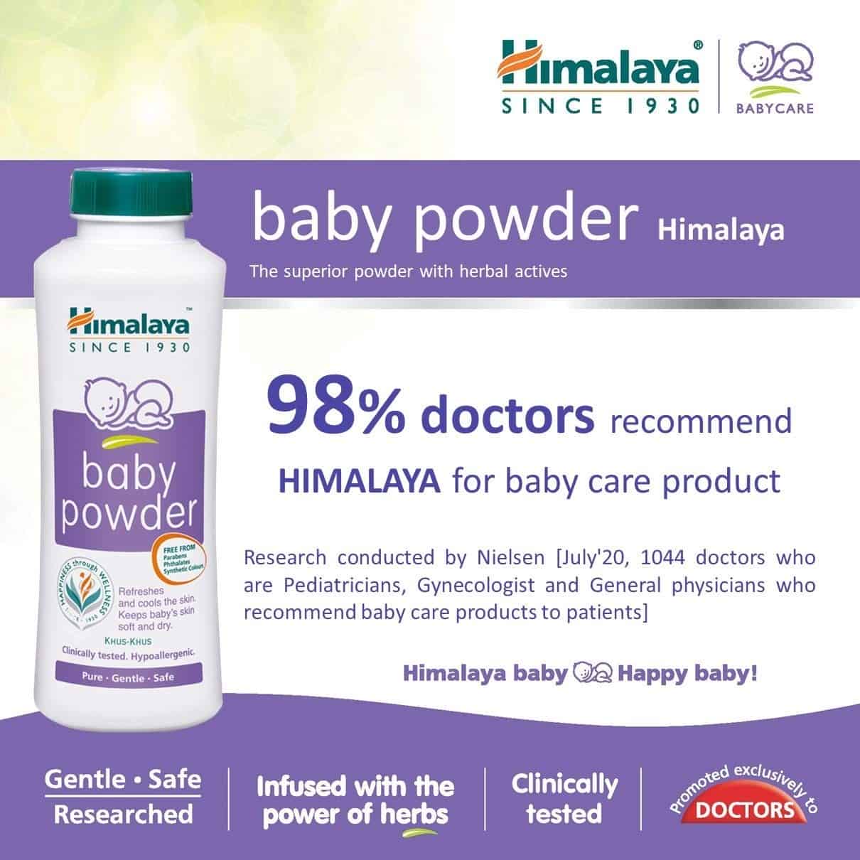 Himalaya offers a yielding and cool baby powder that revives and cools your baby's skin and keeps it dried out. It augmented with the cooling extracts of Olive and Sandal, it revives the baby's skin and keeps it dehydrated, yielding and soft. It averts body odour.