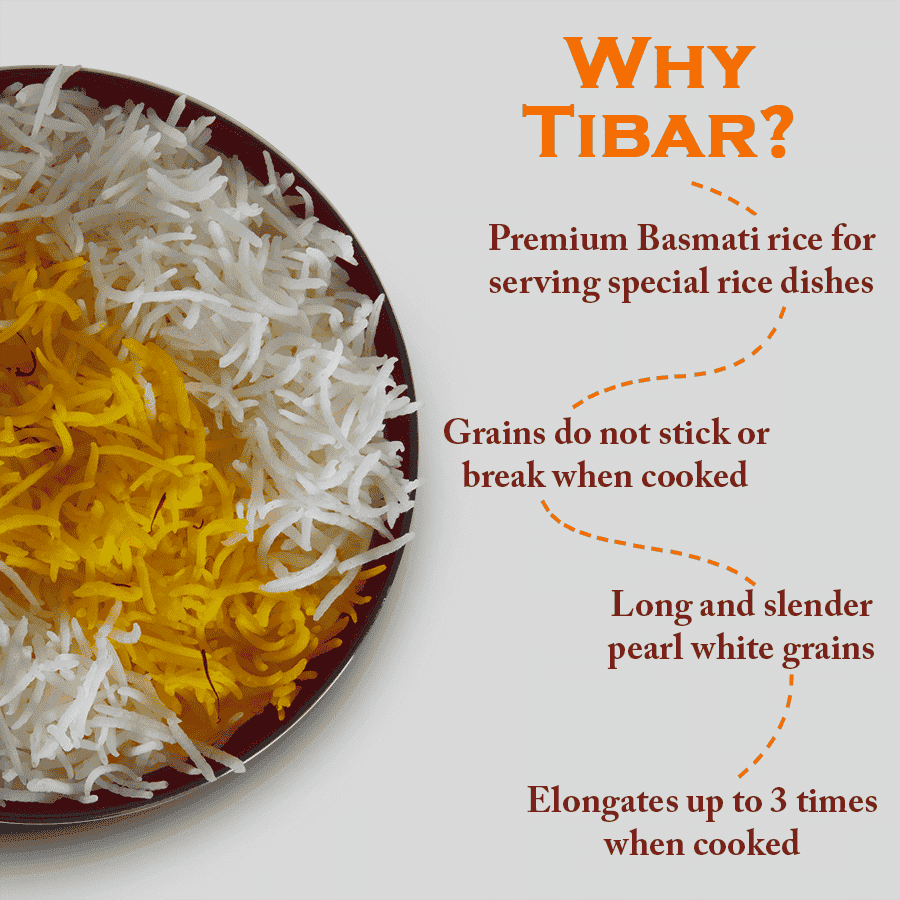 India Gate Tibar Basmati rice is special from other rice mostly due to the fragrance and length post cooking. Its aromatic, nutlike flavor and fragrance can be attributed to the fact that the grain is aged, to reduce its moisture content.