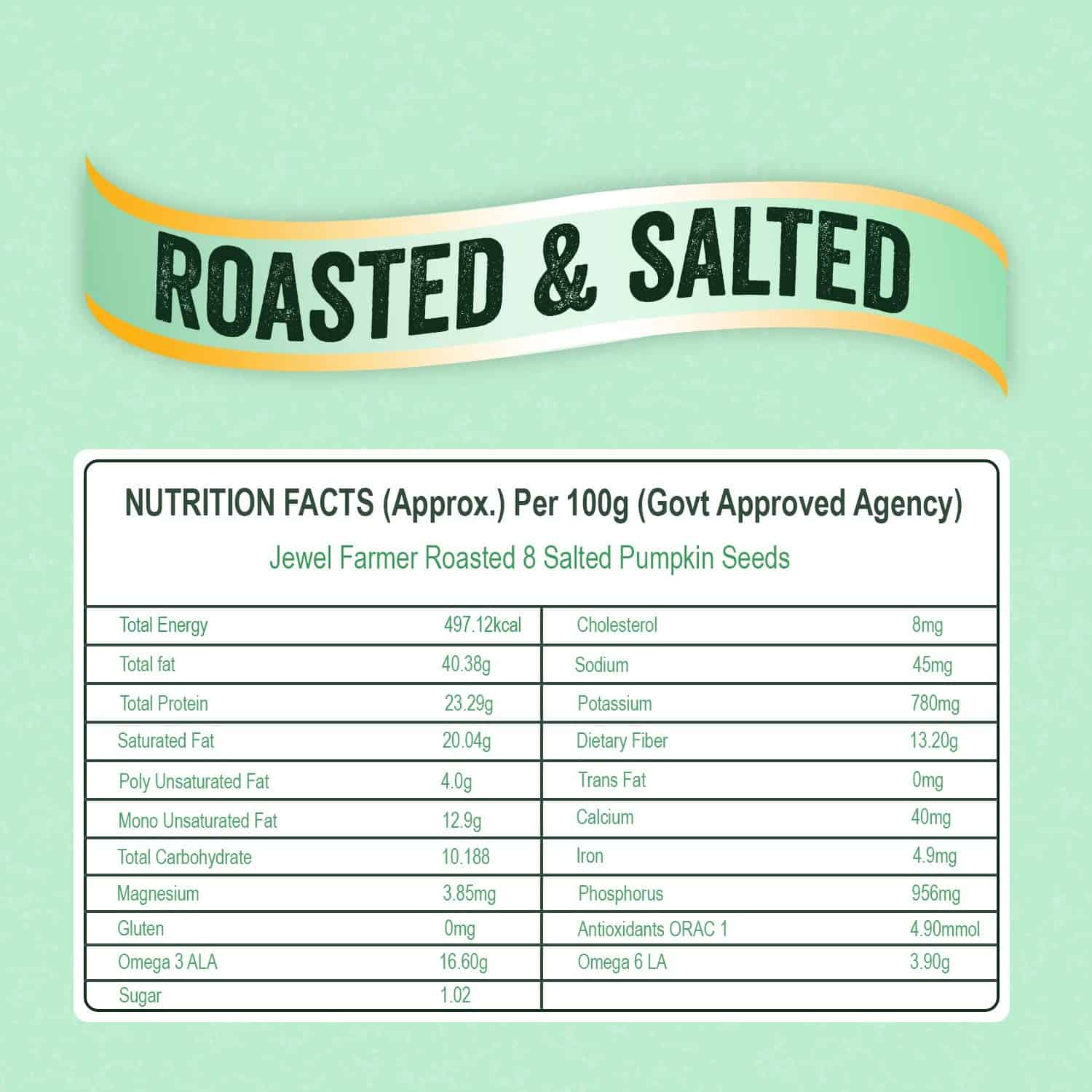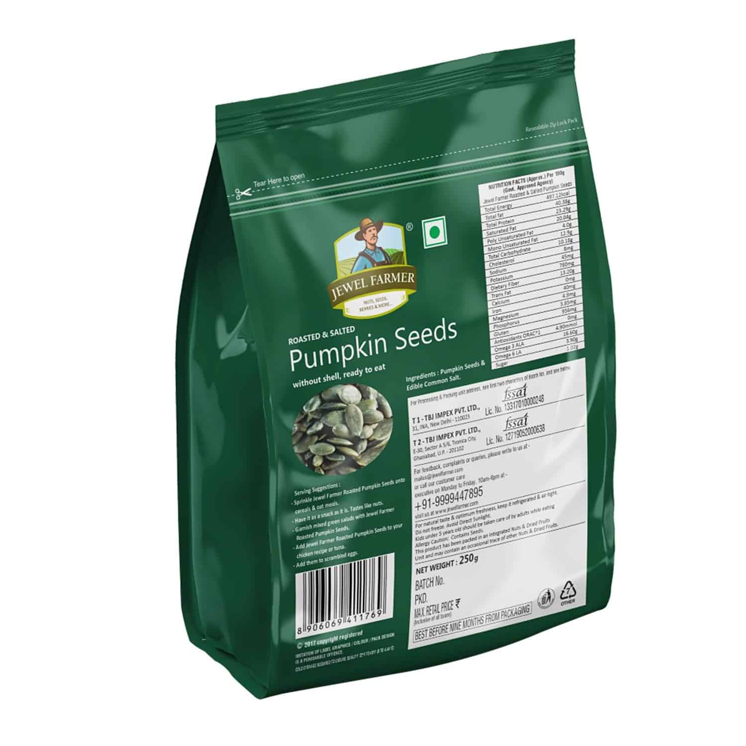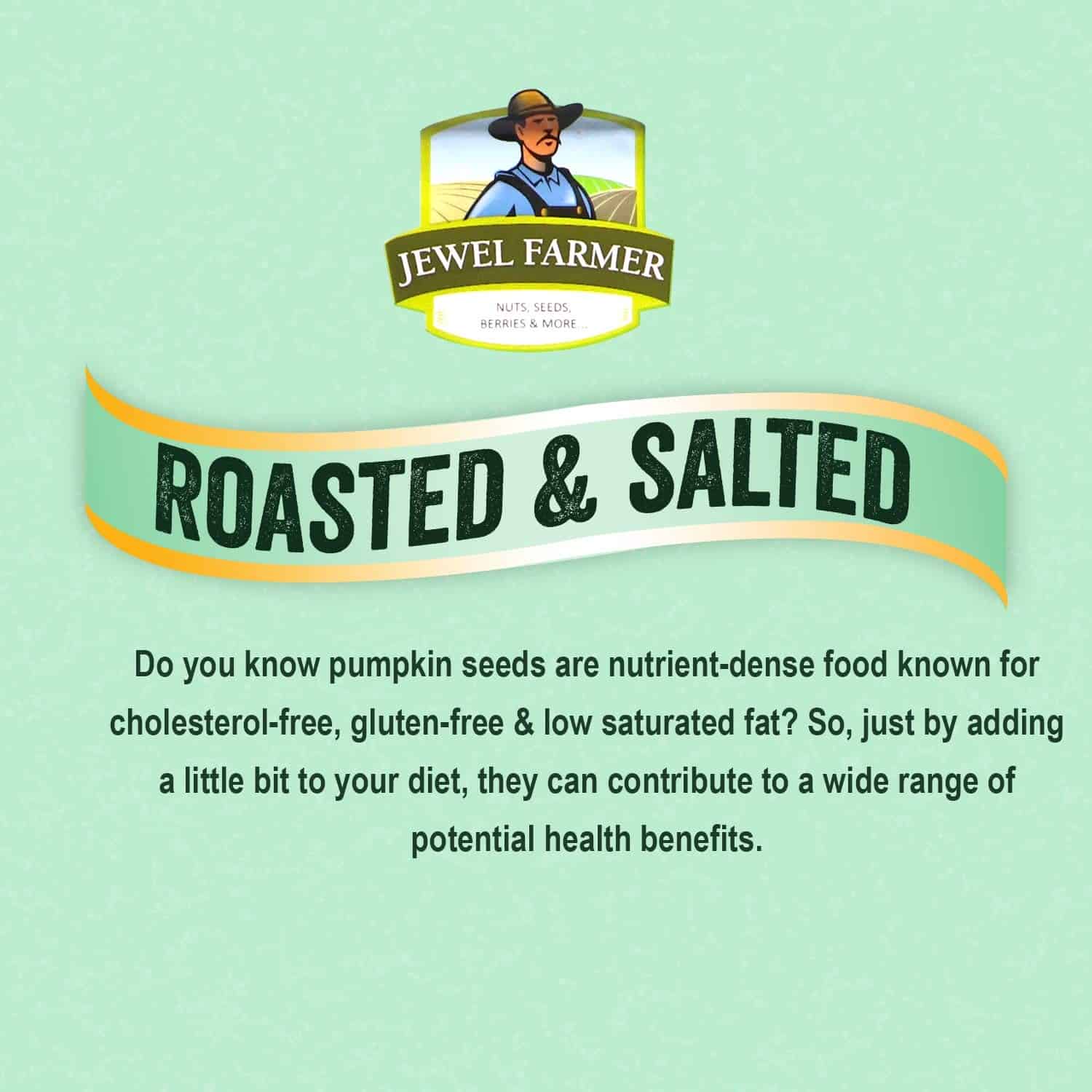 ROASTED & SALTED PREMIUM PUMPKIN SEEDS: Jewel Farmer is providing high quality, naturally procured kernels of pumpkin seeds in roasted form. Having no shell, this pack of ready to eat pumpkin seeds is crunchy and nutty in flavour helps in boosting immunity.