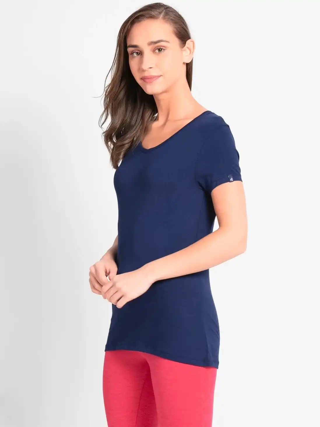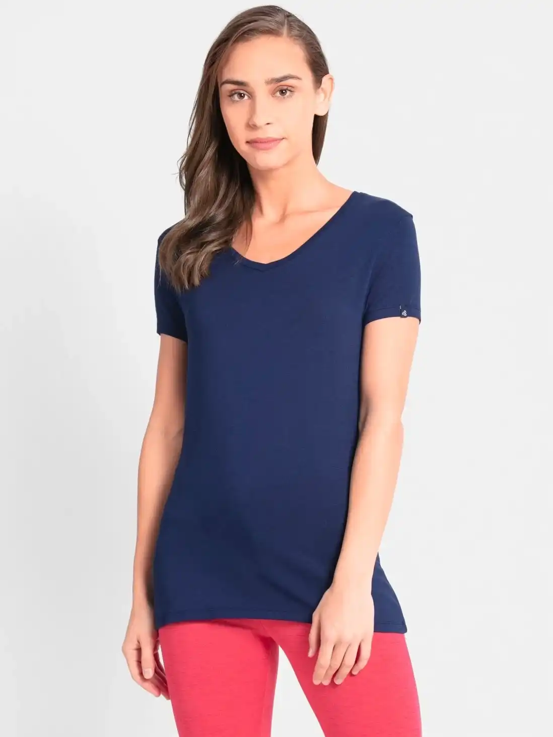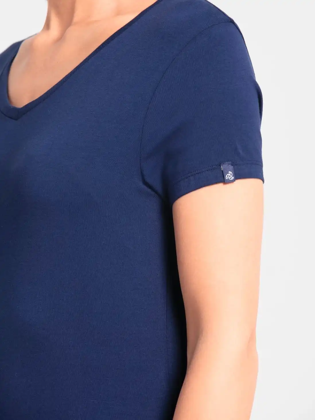 Jockey Solid V Neck Half Sleeve T-Shirt for Women - Imperial Blue, Style #1359
