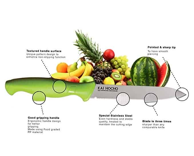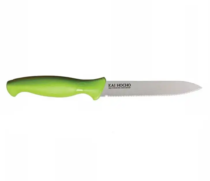 The KAI Hocho knife is perfect for your regular kitchen use. Perfect for cutting and peeling fruits and vegetables, the KAI Hocho has a pointed and sharp tip that allows for easy and smooth piercing. The ergonomic design of the handle, with a textured surface, ensures that the knife does not slip while in use. The high quality blade, backed by 108 years of metallurgy experience, ensures a long and rust free life for your flatware. Cooking will get a whole lot easier with the KAI Hocho
