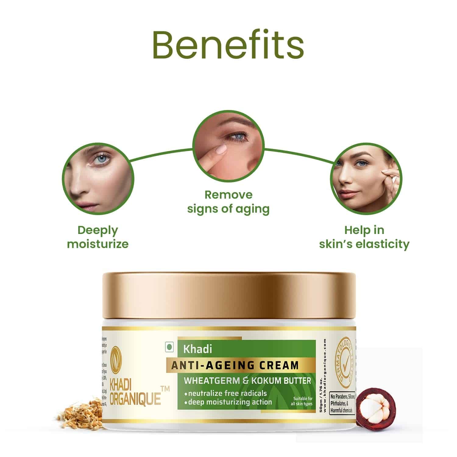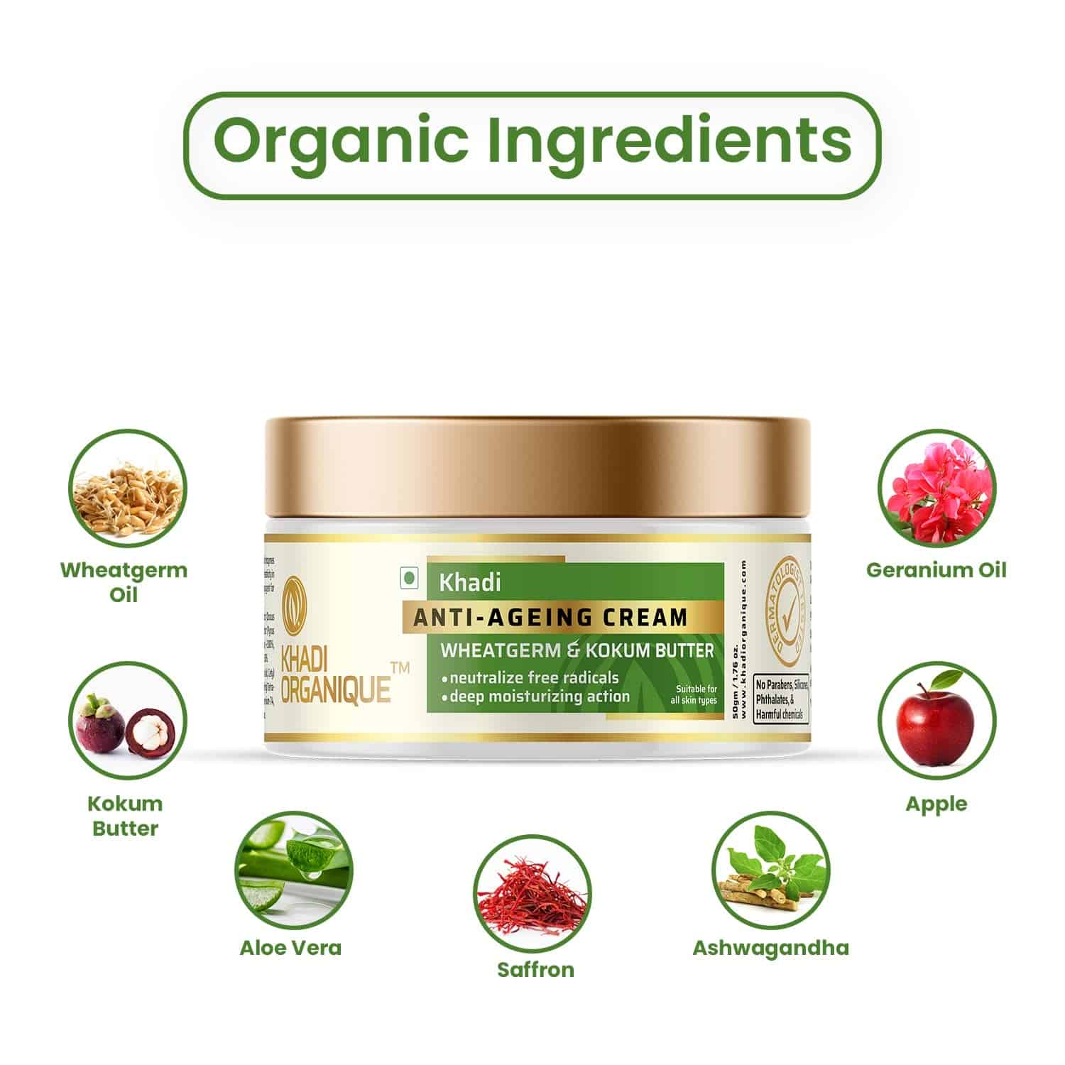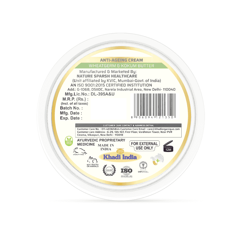 KHADI ORGANIQUE ANTI- AGING CREAM specially designed with multivitamins and enzymes fights with signs of ageing, protect the skin by neutralizing free-radicals and promote elasticity in your skin. Enriched with Kokum Butter and Wheatgerm Oil acts as deep moisturizing agent for nourishing without clogging the pores of skin.
