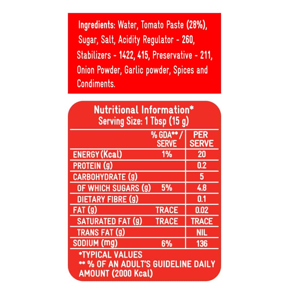 Kissan Fresh Tomato Ketchup is made with 100% real, naturally ripened Tomatoes. The Tangy Tomato Ketchup can either be paired with almost every dish to make them so much tastier. It's an assured hero for all the snacks - be it samosas, pakoras, noodles or roti roll a perfect ally for making wholesome and yummy food. Kissan Tomato ketchup helps healthy foods turn into yummy and tasty for kids. You can use this tomato ketchup as a tomato sauce or tomato chutney.
