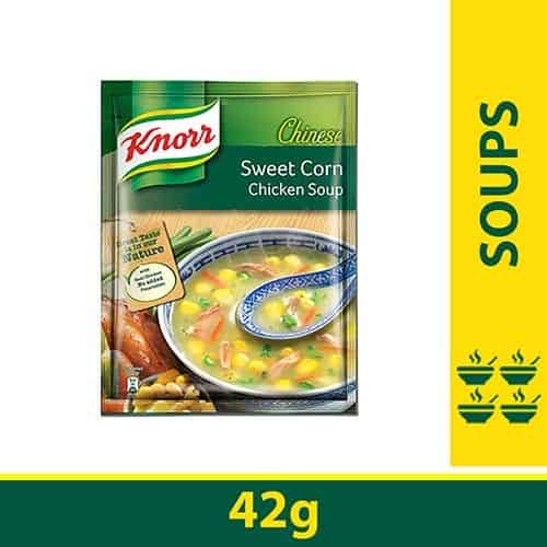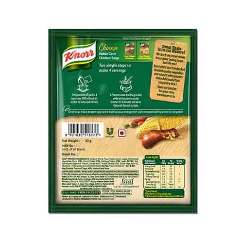 Knorr has hand-picked the best quality vegetables and mixed it with spices to make delicious Knorr Sweet Corn Chicken Soup. A perfect blend of corn, carrots, cabbage and chinese flavors with real chicken gives it its lip-smacking taste and perfect consistency. Made with 100% real vegetables and no added preservatives, this soup is ready in three simple steps and serves four. So now enjoy Restaurant like delicious Soup at home.Knorr Soups range comprises of 11 delicious flavours of 4 serve soups and 7 flavours of Cup-a-soup. Great taste is in our Nature! Knorr has gone to great lengths to ensure a perfect blend of Ingredients and consistency that give you Restaurant like Soup at home.About Knorr: Just like you, we love everything about food, because no delicious meal is cooked without love. Love for carefully selected Ingredients, flavours and spices, or the aroma of dinner wafting through your home. Love for the people you feed everyday; your family and friends, relatives and guests, the people that matter to you the most. With Knorr as your cooking partner, you can serve your loved ones nutritious and flavourful meals at home. Soup Fun Fact - The word soup is of Sanskrit origin! It is derived from the su and po, which means good nutrition.