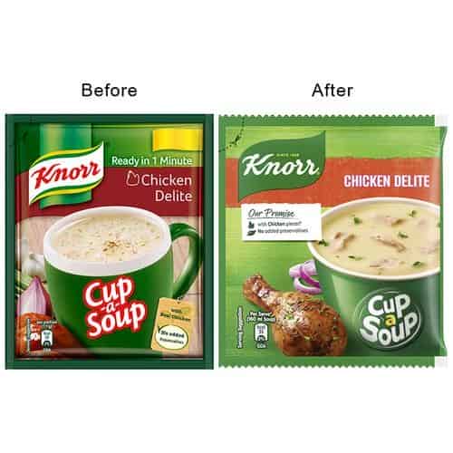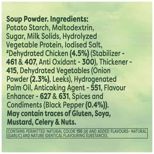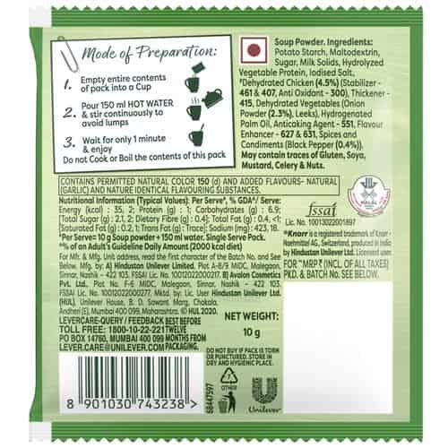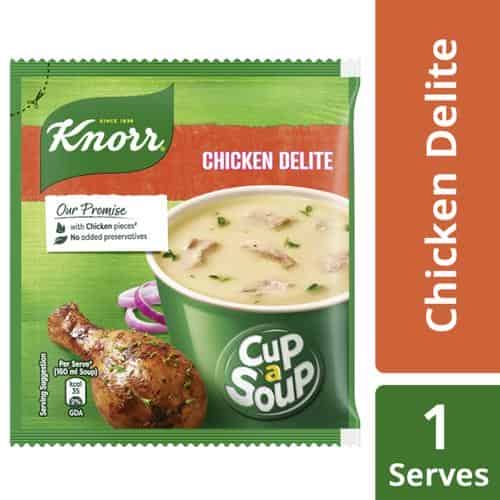 Knorr Chicken Delite Cup-A-Soup is a classic chicken soup made with real chicken. Knorr Chicken Delite Cup-A-Soup satisfies your small hunger pangs in just 1 minute. Enjoy this delicious soup with real chicken. Made with 100% real vegetables and no added preservatives, this soup is ready in three simple steps. So now enjoy Restaurant like delicious Soup at home.Knorr Soups range comprises of 11 delicious flavours of 4 serve soups and 7 flavours of Cup-a-soup. Great taste is in our Nature! Knorr has gone to great lengths to ensure a perfect blend of Ingredients and consistency that give you Restaurant like Soup at home.About Knorr: Just like you, we love everything about food, because no delicious meal is cooked without love. Love for carefully selected Ingredients, flavours and spices, or the aroma of dinner wafting through your home. Love for the people you feed everyday; your family and friends, relatives and guests, the people that matter to you the most. With Knorr as your cooking partner, you can serve your loved ones nutritious and flavourful meals at home. Soup Fun Fact - The word soup is of Sanskrit origin! It is derived from the su and po, which means good nutrition. Features and Benefits: