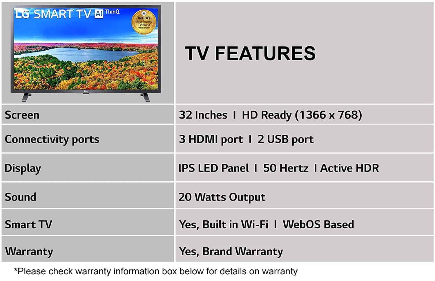 Warranty Information: 1 Year LG India Comprehensive Warranty and additional 1 year Warranty is applicable on panel/module from the date of purchase