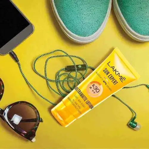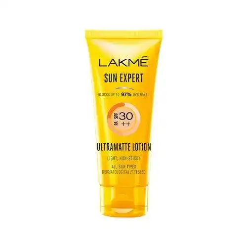 Think sunscreens are needed just on holiday Think again - it takes just 7 minutes for the sun to start damaging your skin in this hot Indian weather. Choose Lakme Sun Expert - your daily sunscreen lotion which is light enough to be used all year round. It contains cucumber, lemongrass, Vitamin B3 and has been tested by dermatologists. Suitable for all skin types - this lightweight lotion provides broad-spectrum UV protection.