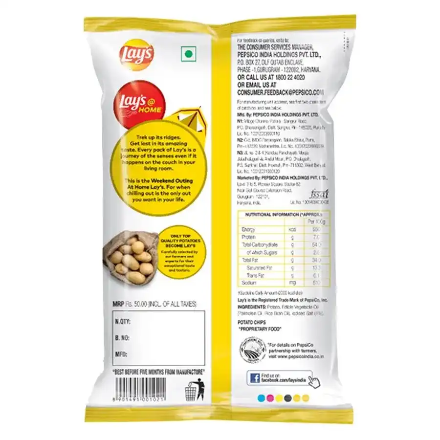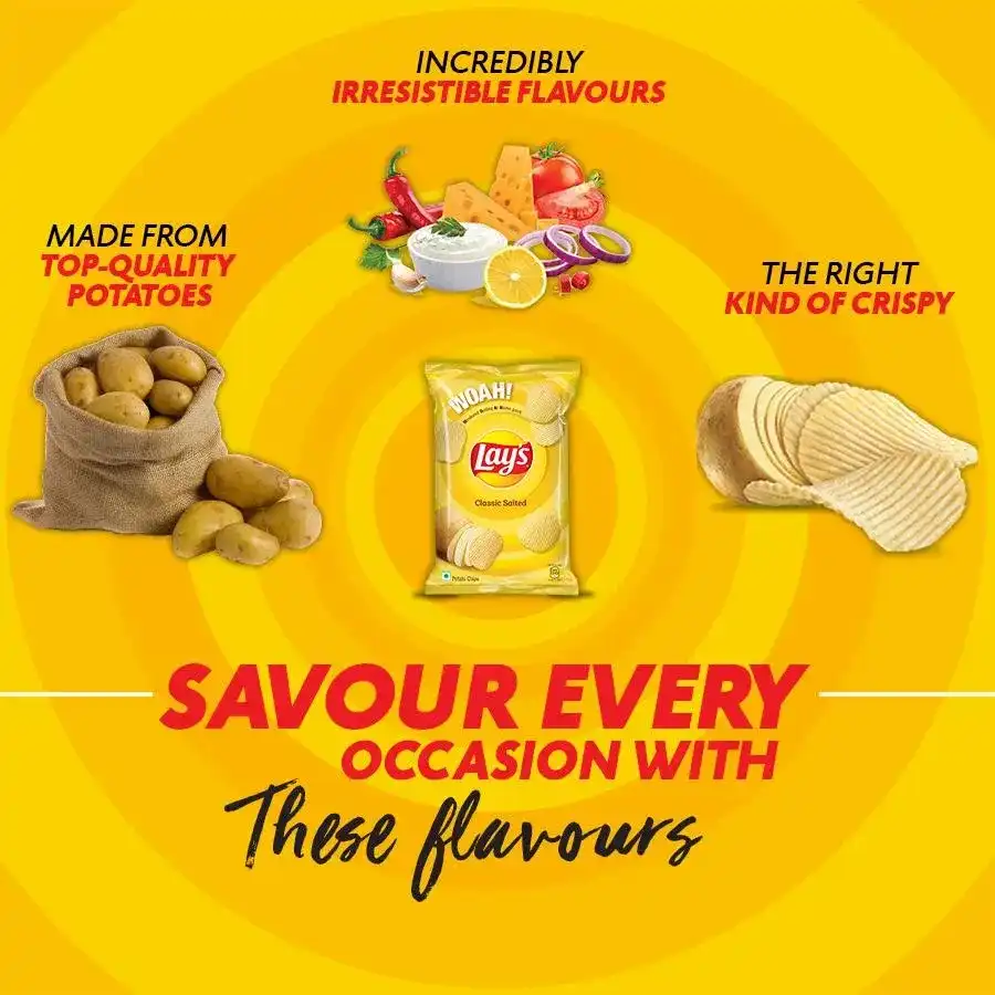 Experience the signature taste with the best quality potatoes sprinkled with salt. Each bag of Lay's Classic Salted Potato Chips is a reminder of how good the simple life is. From the everyday snack to the impromptu get-togethers, Lays chips are the perfect addition to any occasion. Whether its party time or family time, everyone loves gathering around the chip bowl.