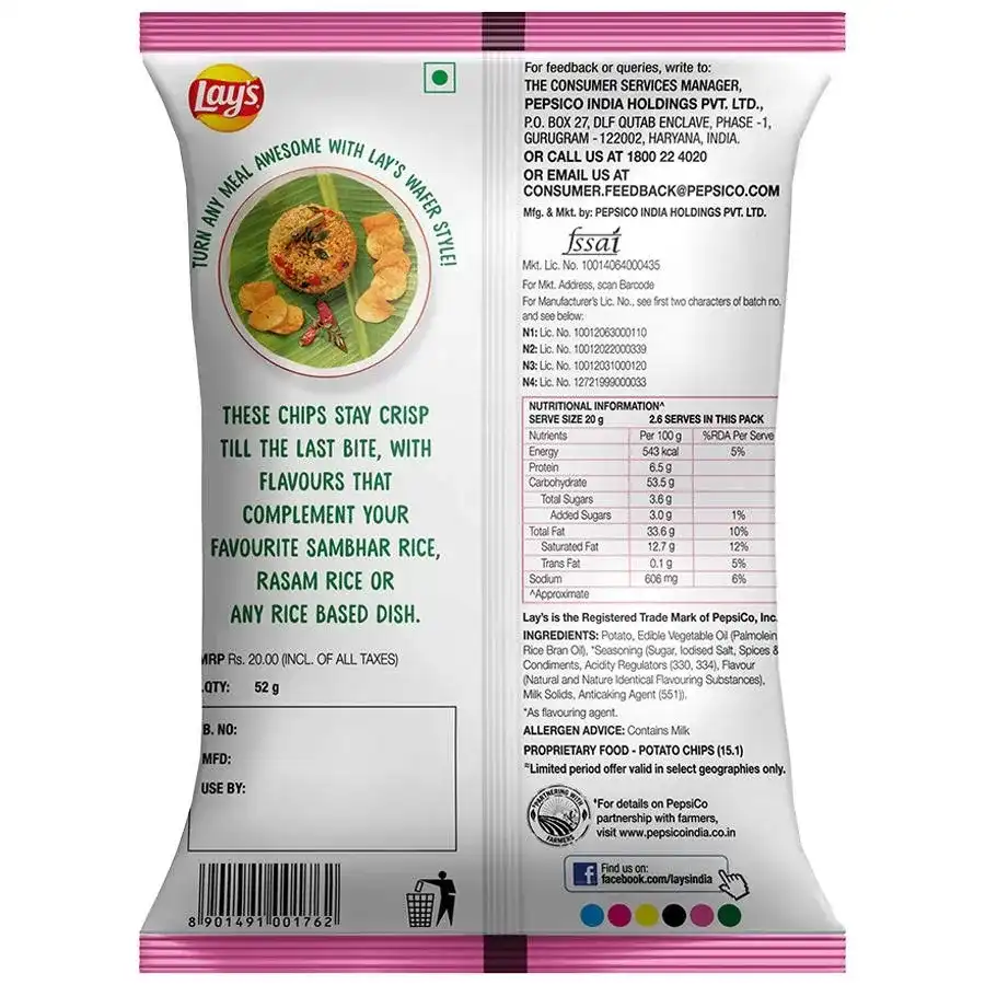 Lay's Wafer Style brings to you Tangy Treat flavoured chips. It has a unique shape, irresistible taste and is seasoned from edge to edge for a perfect flavour in every bite. India's favourite potato chips have a perfect tangy flavour. It has beautiful flavours that have a powerful impact on your taste buds.