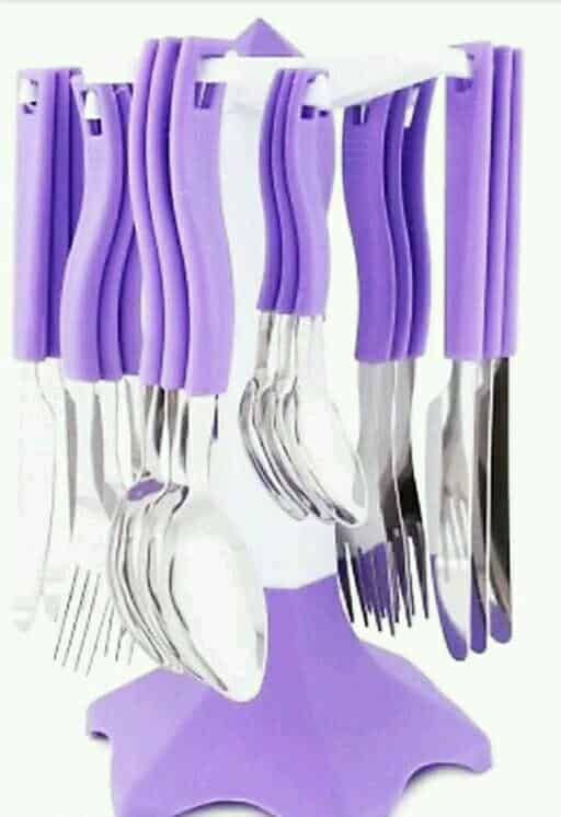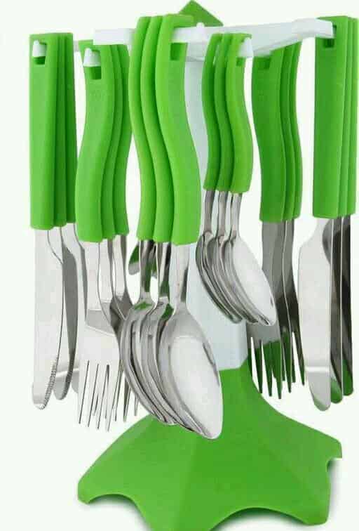 It Has 6 Pieces Of Dessert Spoon ,6 Pieces Dessert Fork ,6 Pieces Soup Spoon , 6 Pieces Baby Spoon,1 Piece Butter Knife, and 1 Piece Revolving Stand