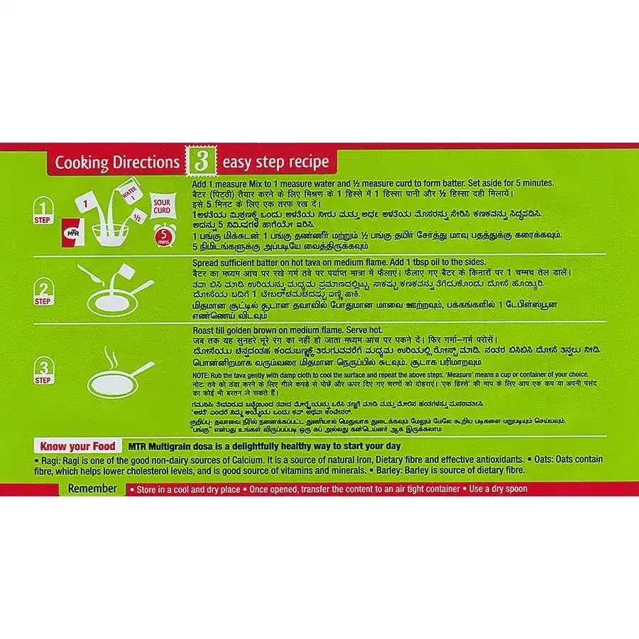 MTR Multigrain Dosa Mix extracted from high-grade pure rice, urad dal and fenugreek. Dosa is a south Indian traditional dish that is rich in taste and low in fats. It's a delicious comfort food which you can enjoy every evening with family and friends.