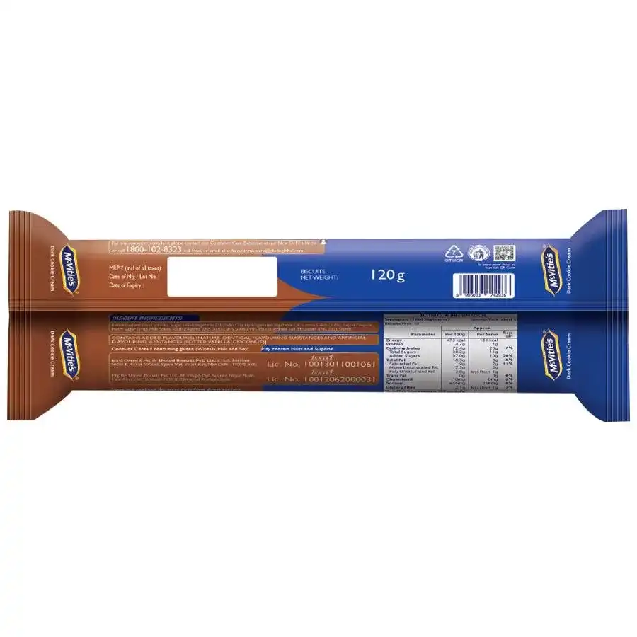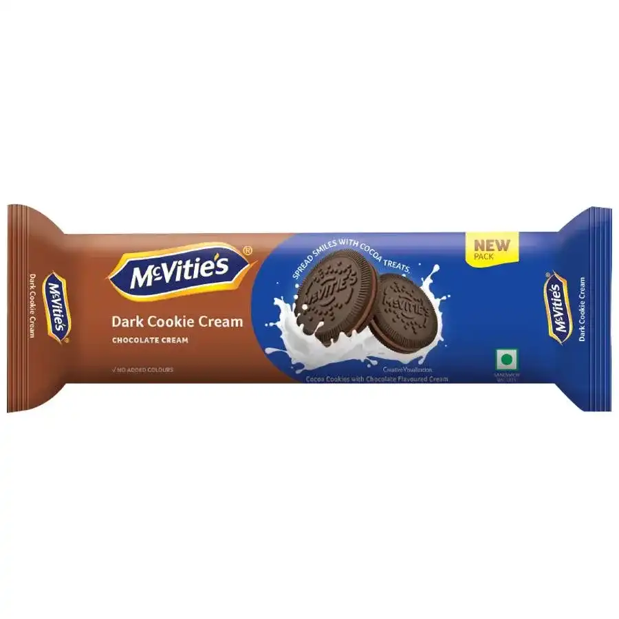 McVitie's Dark Cookie Cream Chocolate Biscuits comes with the goodness of vanilla and cocoa. These cream cookies are also known as cream biscuits. The two thin cookies are filled with vanilla cream. These cookies promise to spread a smile making a great cocoa treat. It is loved by all the kids as well as the adults. It is a perfect anytime snack option.