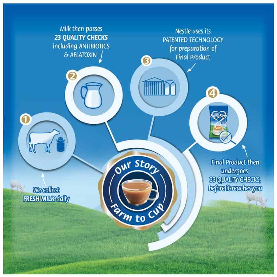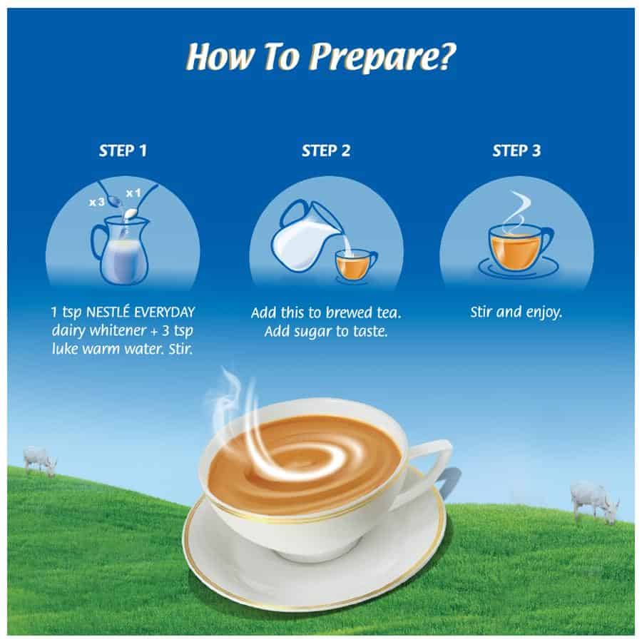 Nestle EVERYDAY is a dairy whitener or dried milk powder that mixes in completely with your tea to lift its taste - so you get a thicker & tastier cup of tea, every time. We at Nestle use milk of the highest quality, and also use our international dairy know-how to carefully dry and balance this milk powder without losing any of its goodness, so that you and your family can enjoy a thicker, milkier, tastier cup of tea - with EVERYDAY, tea's perfect partner! Did you know that EVERYDAY is the No.1 selling dairy whitener in the country. It’s no wonder then, that in blind taste tests consumers ranked tea made with EVERYDAY milk powder as their No.1 choice for a perfect cup of tea! Serving