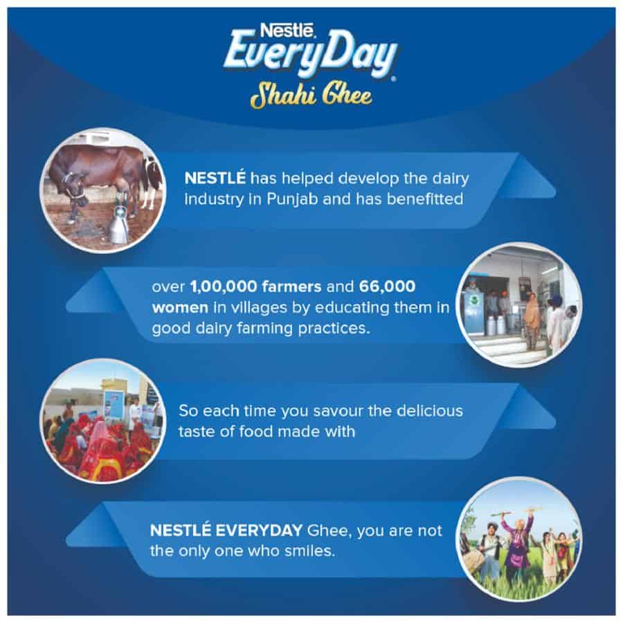 Nestle Everyday Shahi Ghee is the result of continuing efforts by Nestle to bring to you great-tasting and convenient dairy products. As a part of which, Nestle has helped develop the dairy industry in Punjab and has benefitted over 1,00,000 farmers and 66,000 women in villages by educating them in good dairy farming practices.