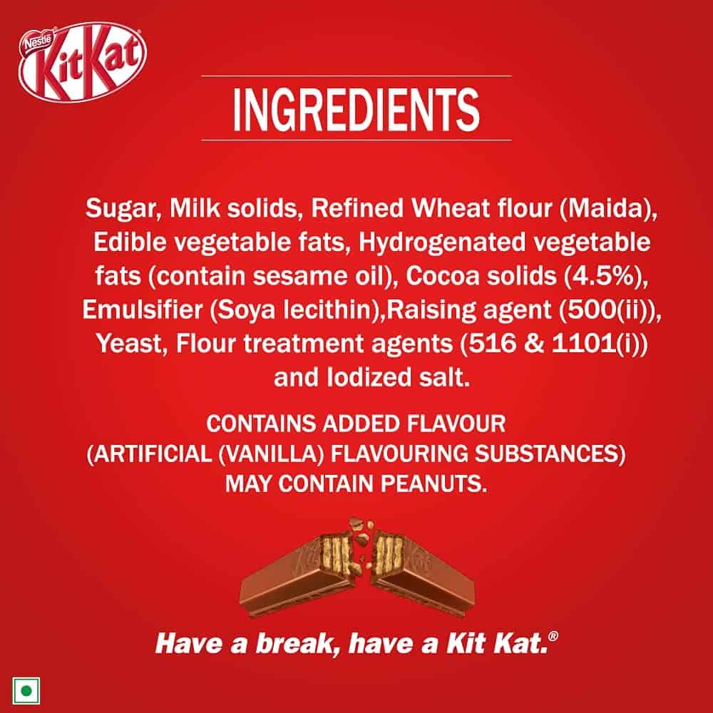 Nestle KITKAT is the ideal partner for your breaks. Indulge in this delicious crispy treat alone or share it with your loved ones. Enjoy your breaks with this treat with approx. 48 kcal per finger. Just unwrap your KITKAT, break off one of the fingers, snap into two and enjoy! HAVE A BREAK, HAVE A KITKAT.