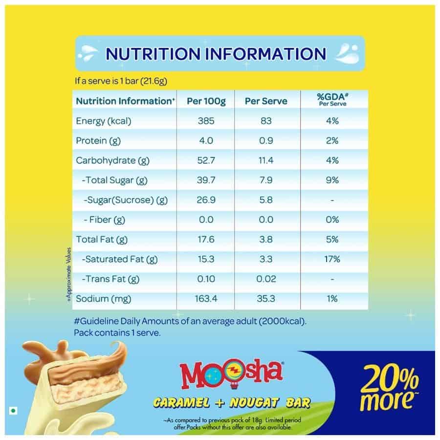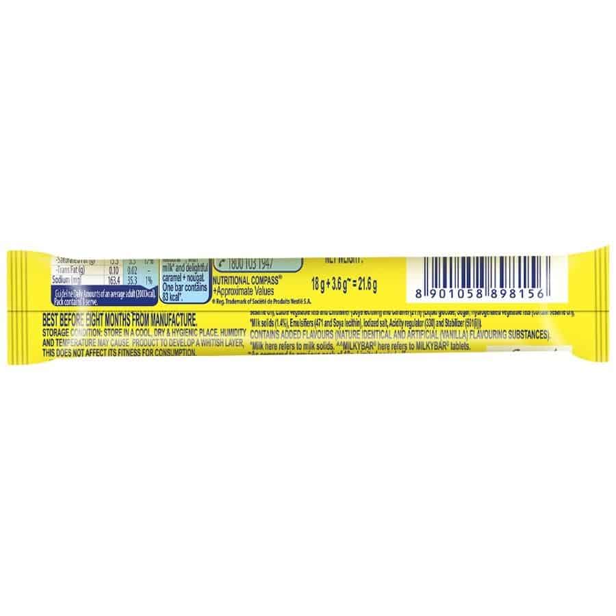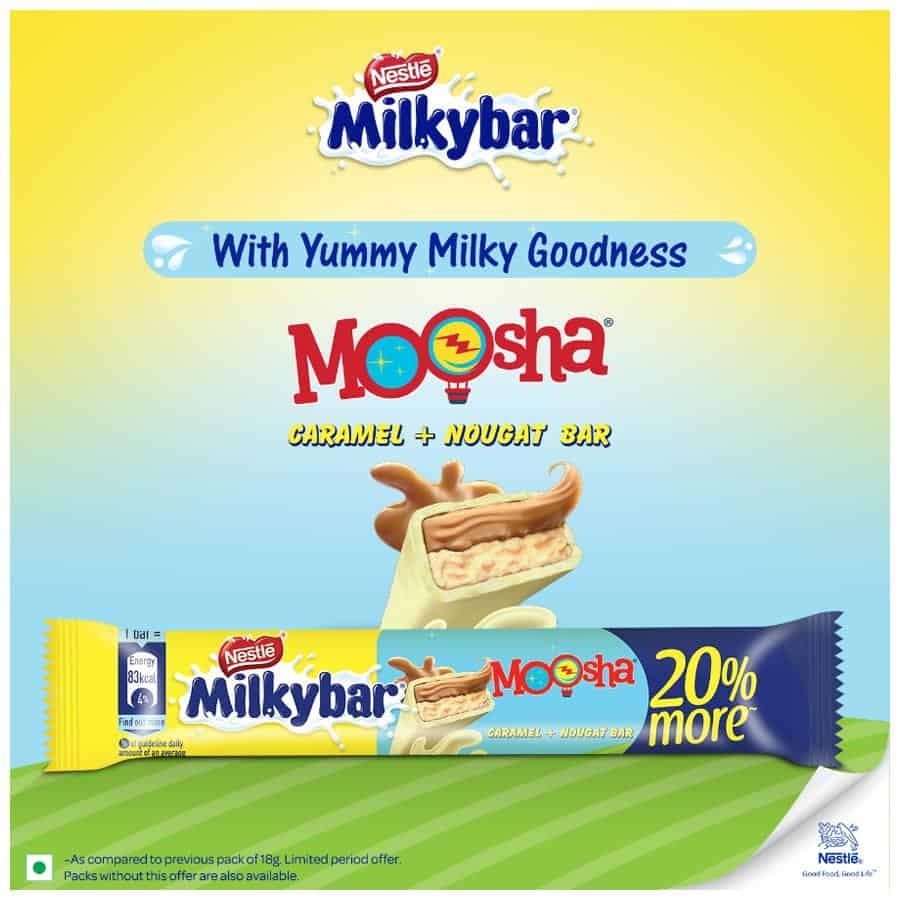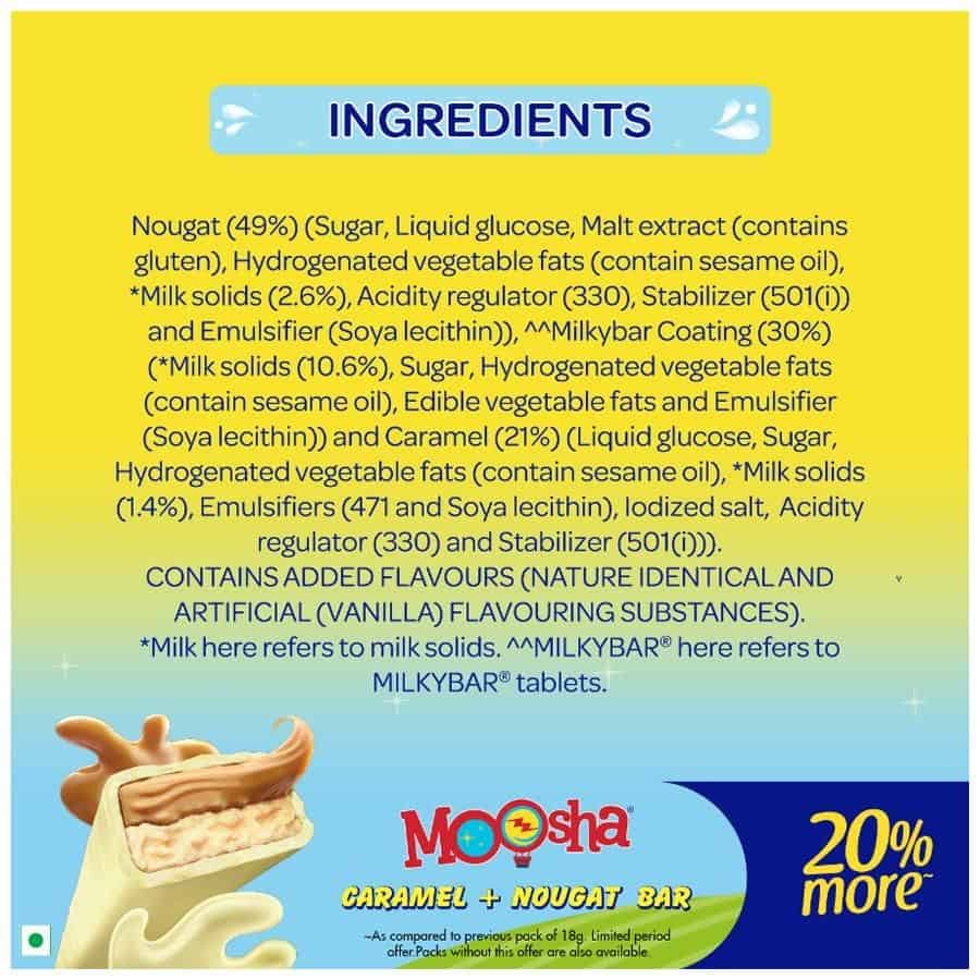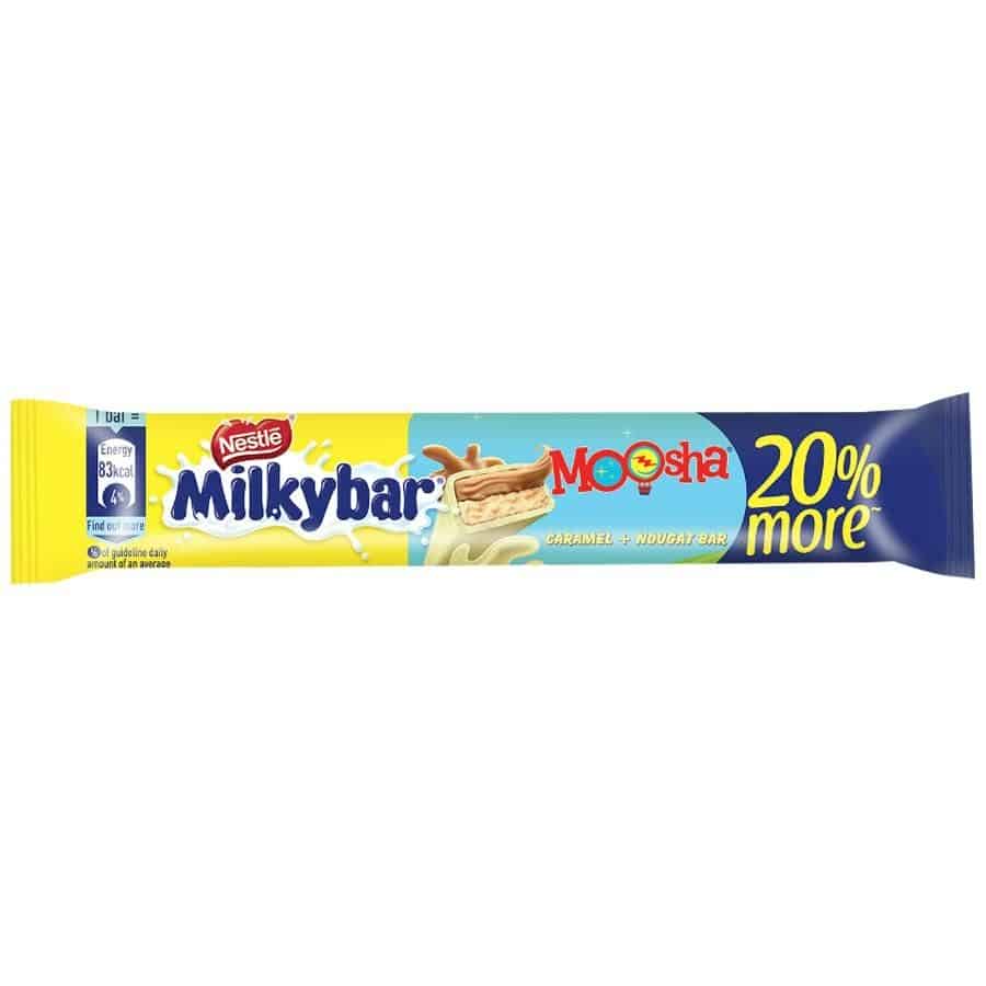 Presenting the all-new Milky Bar Moosha with Milk* and delightful caramel nougat in 2 shareable bars in 1 pack. Caramel and Nougat delightfully add to your favourite Milkybar taste. The white chocolate bar contains yummy milky* goodness and an irresistible taste. Each bar contains approximately 77 calories.