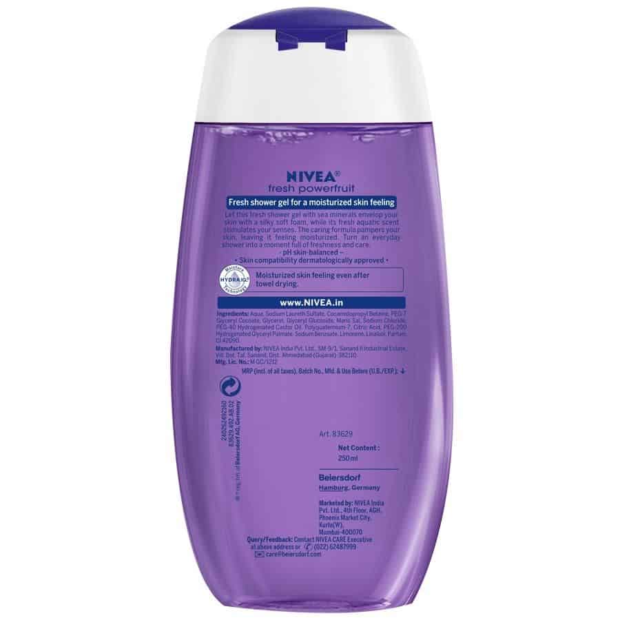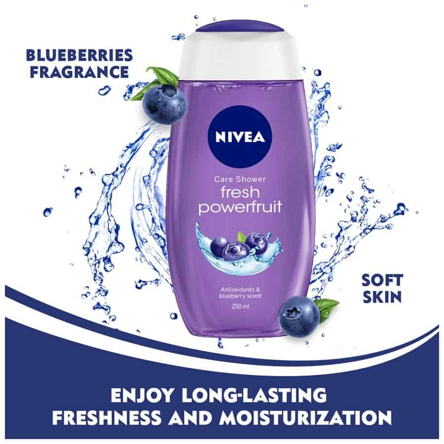 Nivea Shower Gel is an exclusive mixture of Powerfruit and nourishing skincare. Relax with the delicate acai berry aroma while the shower gel, including antioxidants and blueberry, efficiently cleanses your skin, leaving it feeling flexible and well cared for.