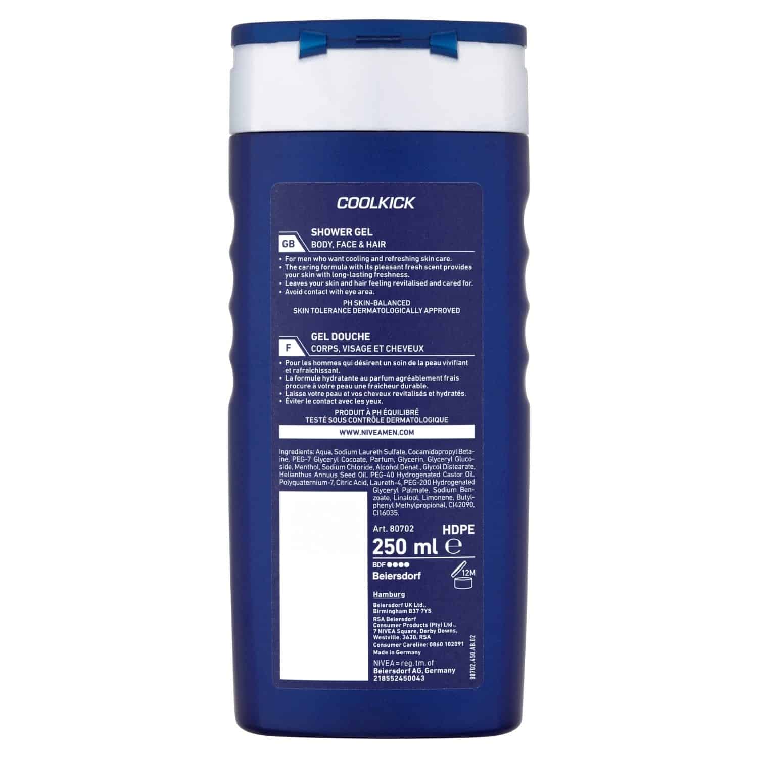 Nivea Men Cool Kick Shower Gel refreshes your mind and body with its icy cool menthol and a pleasantly fresh scent. Freshen up and stay cool with this 3-in-1 shower gel which is meant for Body, Face & Hair. Let the icy blue gel stimulate your senses with the cooling kick of menthol. Kick start your day with every shower. This product is skin tolerance dermatologically proved.