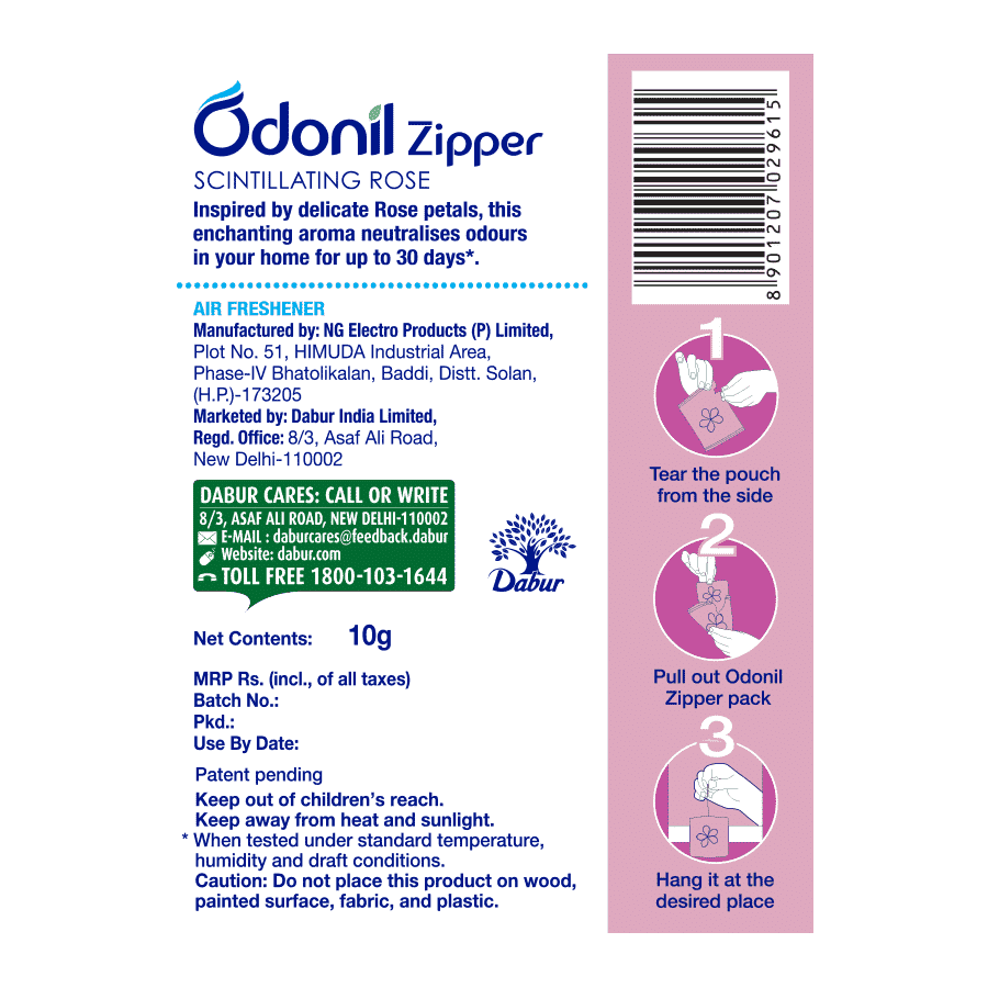 The air freshener revives the exquisite scent of freshly cut roses. You are going to fall for this delectable rose-based fragrance. The aroma of roses will scintillate your senses and elevate your mood. Odonil Zipper has special powerful fragrance perfumes that promise to transform you. It is the most powerful air freshener that gives a blast of fragrance. It lasts up to 30 days and is easy and convenient to use.